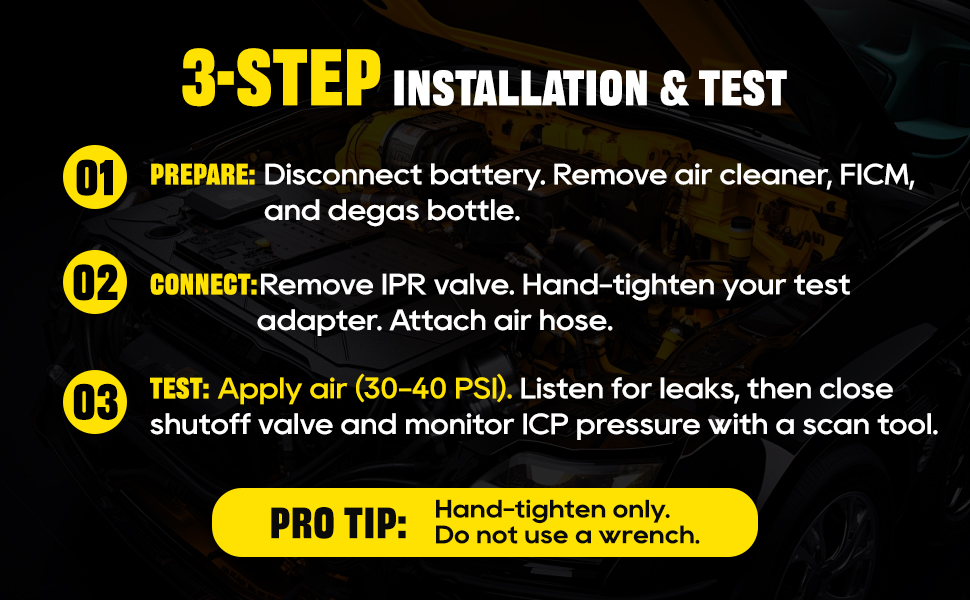 Easy to use:No scan tool or IPR driver required—saves time and hassle. Simple 3-step setup: remove air cleaner/FICM/coolant degas bottle (turbo removal NOT needed), hand-tighten the tool after removing IPR valve, connect shop air and listen for leaks.