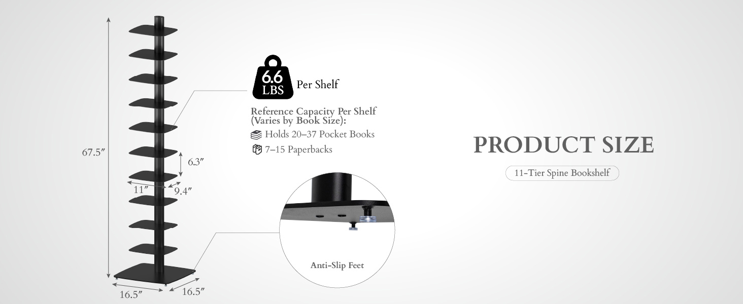 • إرشادات سعة التحميل للاستخدام الآمن: يدعم كل رف ما يصل إلى 6.6 رطل (3 كجم). للحصول على ثبات مثالي، ضع العناصر الأثقل على الرفوف السفلية والأشياء الأخف وزنًا في الأعلى، مع توزيع الوزن بالتساوي. السعة المرجعية لكل رف (تختلف حسب حجم الكتاب): تقريبًا. 20-37 كتاب جيب أو 7-15 كتاب ورقي الغلاف.