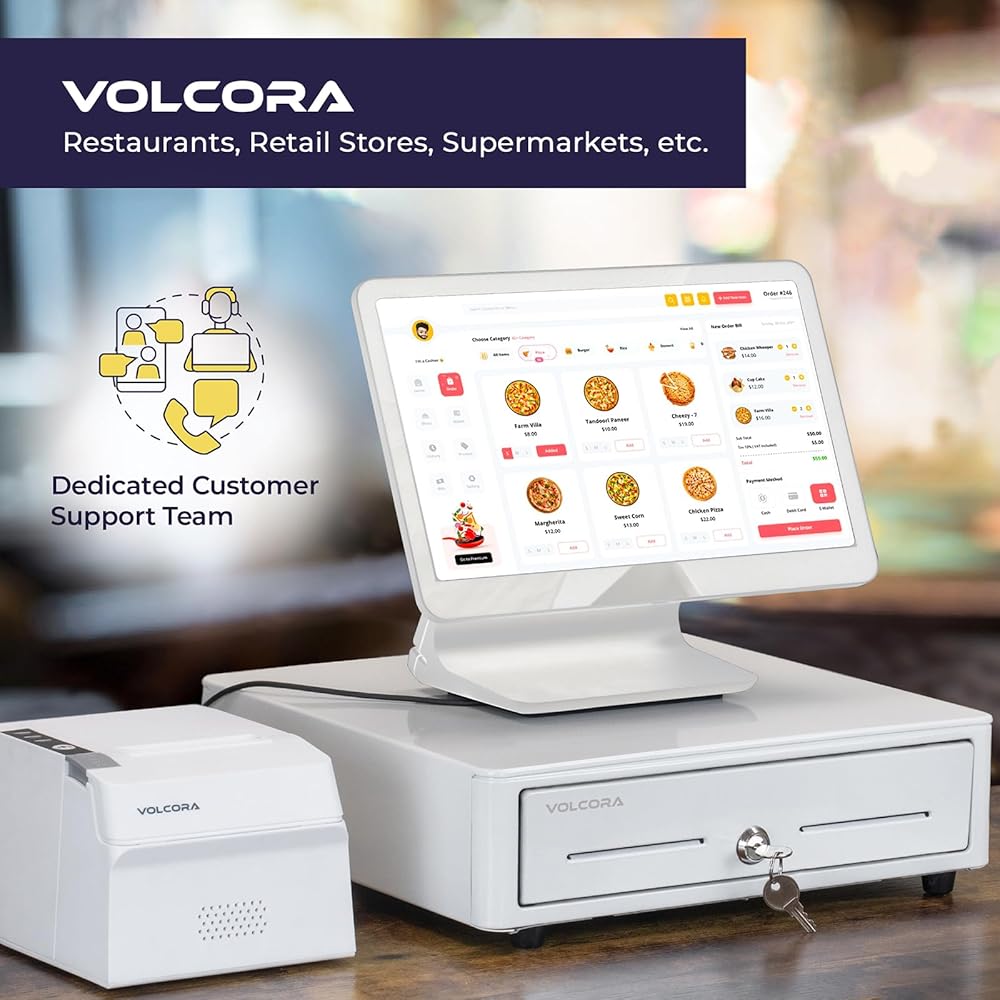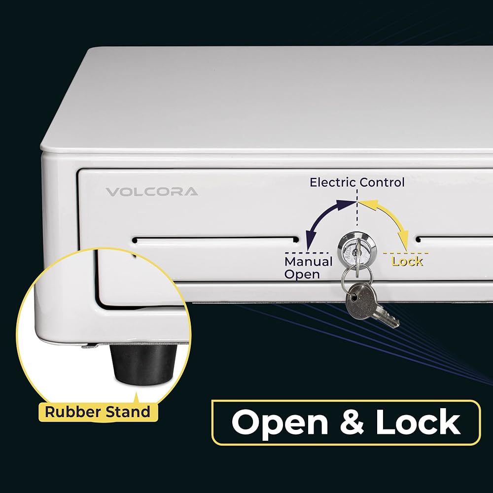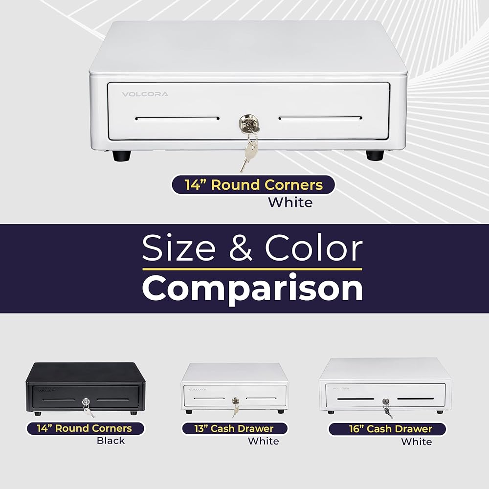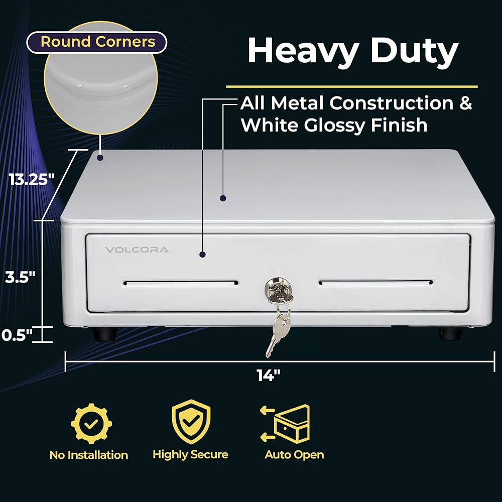 Durable POS Cash Drawer: Volcora cash register drawer with round corners measures 14"x13.25"x4", Color: white, and Voltage: 12-24VDC. Our cash drawer has a heavy duty durable metal frame that is an ideal cash register for small businesses and even big establishments too.
