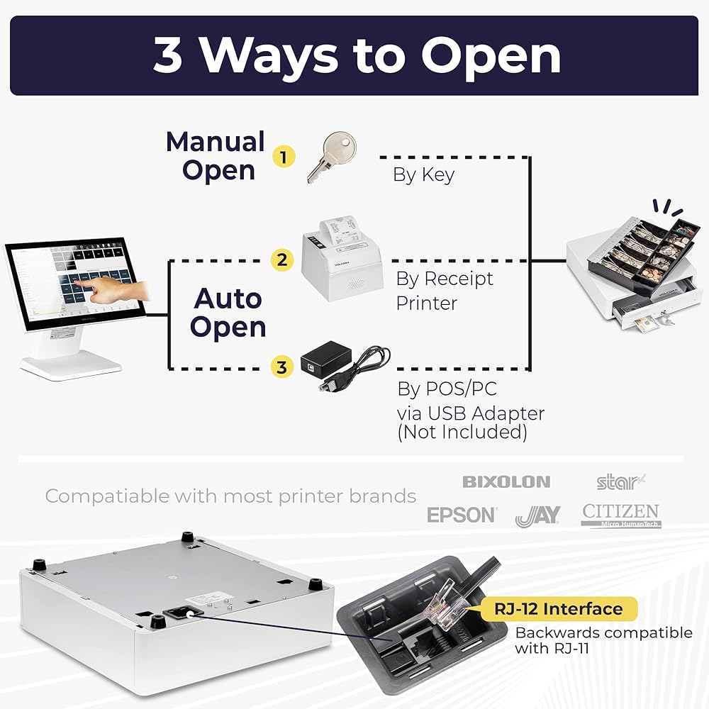 How Cash Registers Work: The cash drawer should be connected to a receipt / thermal printer via RJ11/RJ12 network cable (cash drawer cable included), then connect the printer to your point of sale system (POS) to auto open / close cash tray. Compatible with most major receipt / thermal printer brands, such as Star, Citizen, JAY, and Bixolon. (No USB port, CANNOT be connected to POS directly via USB)