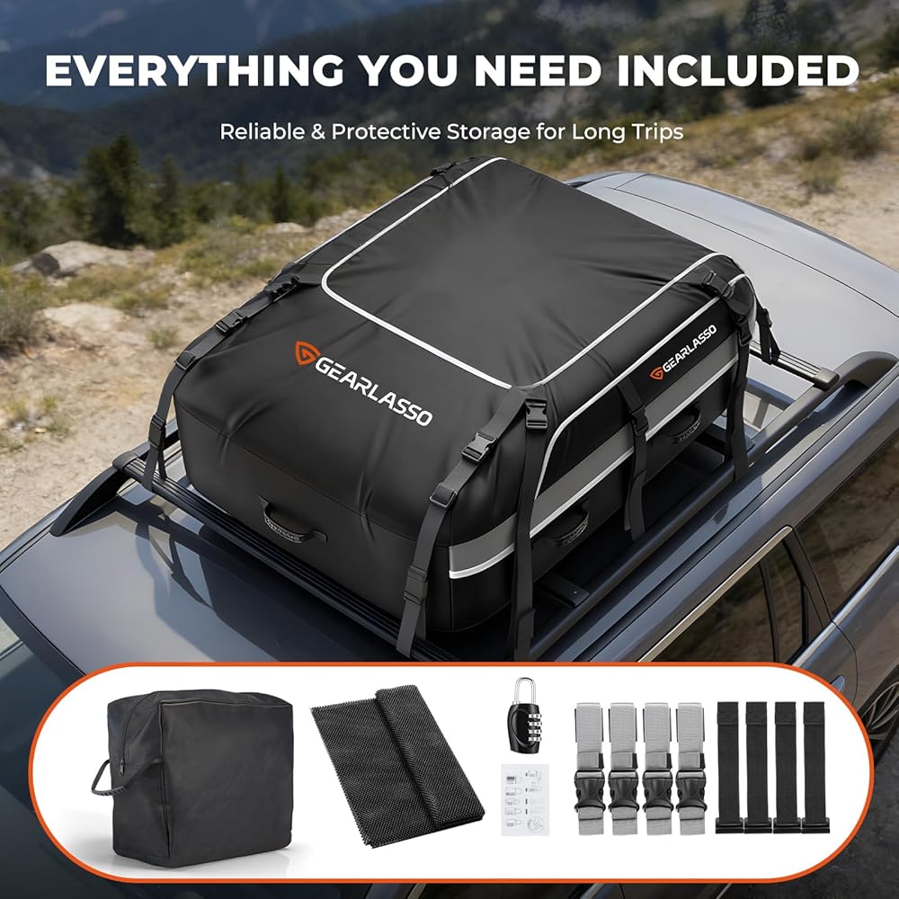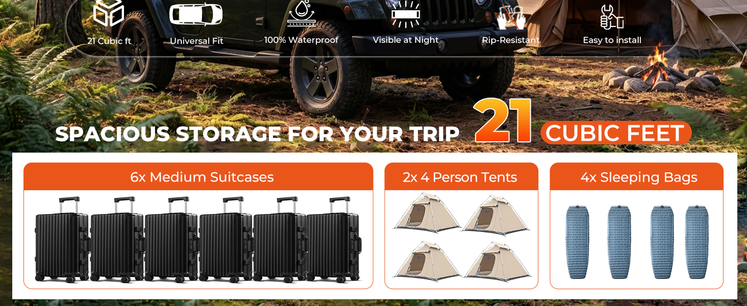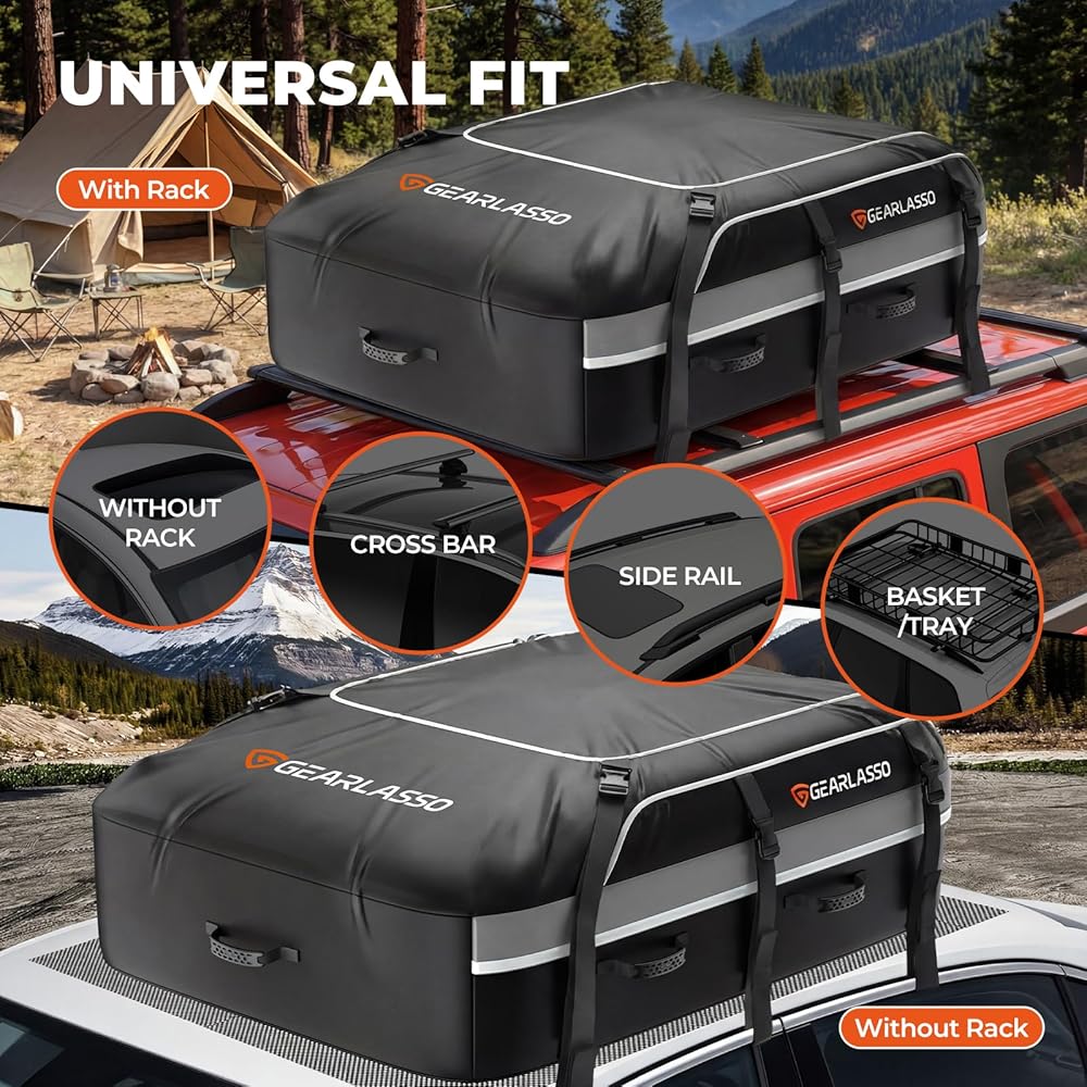 【Large Capacity & Universal Fit】 Fit Designed for cars, SUVs, and vans. Installs securely with or without roof rack, cross bars, side rails, or basket systems—ideal for road trips and family travel