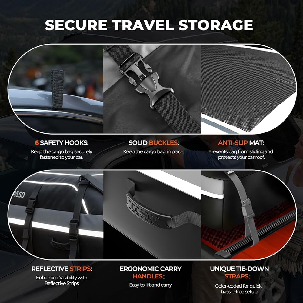 【Secure & Stable】 Includes anti-slip mat, 6 door hooks, solid buckles, and 4 extra straps to keep the cargo bag firmly in place,even on long drives and rough roa