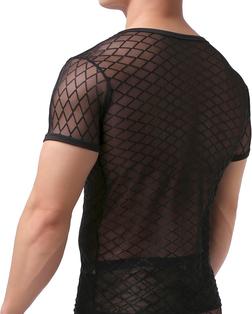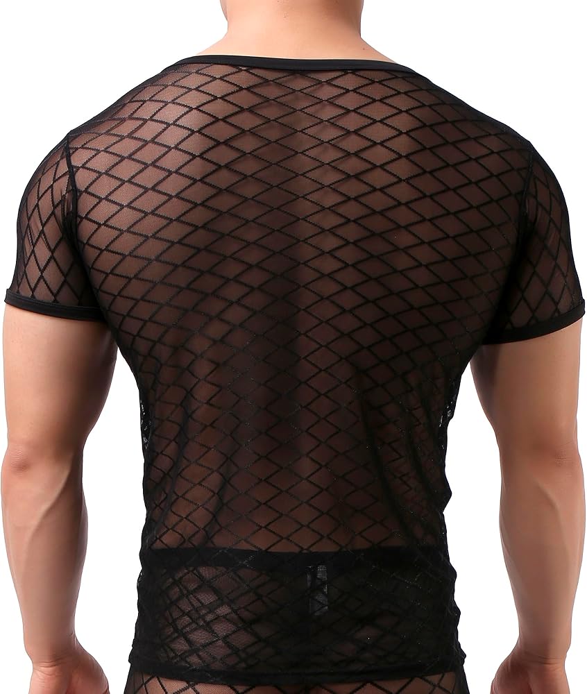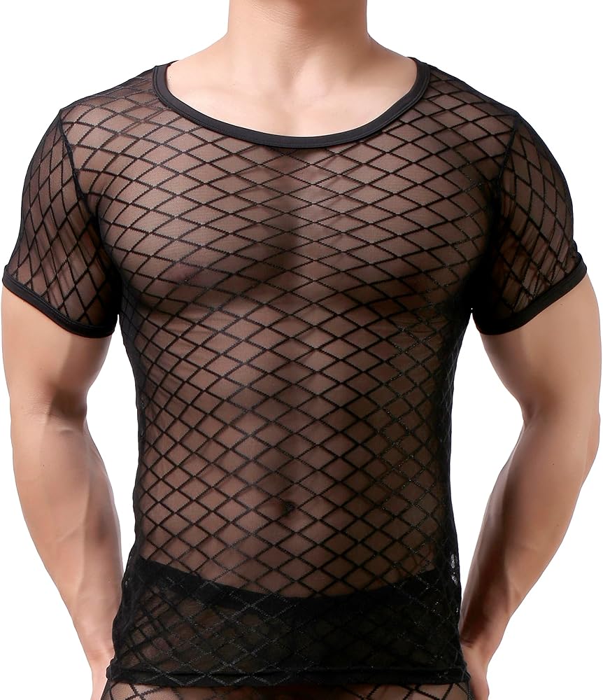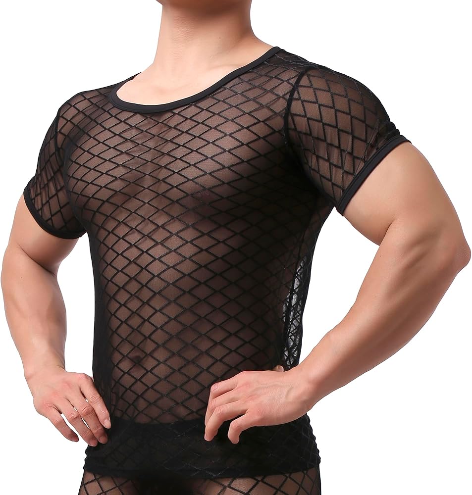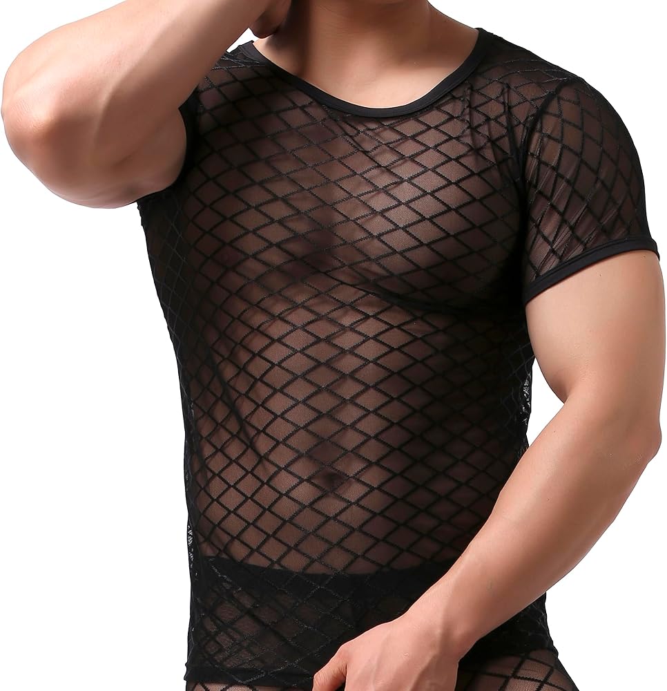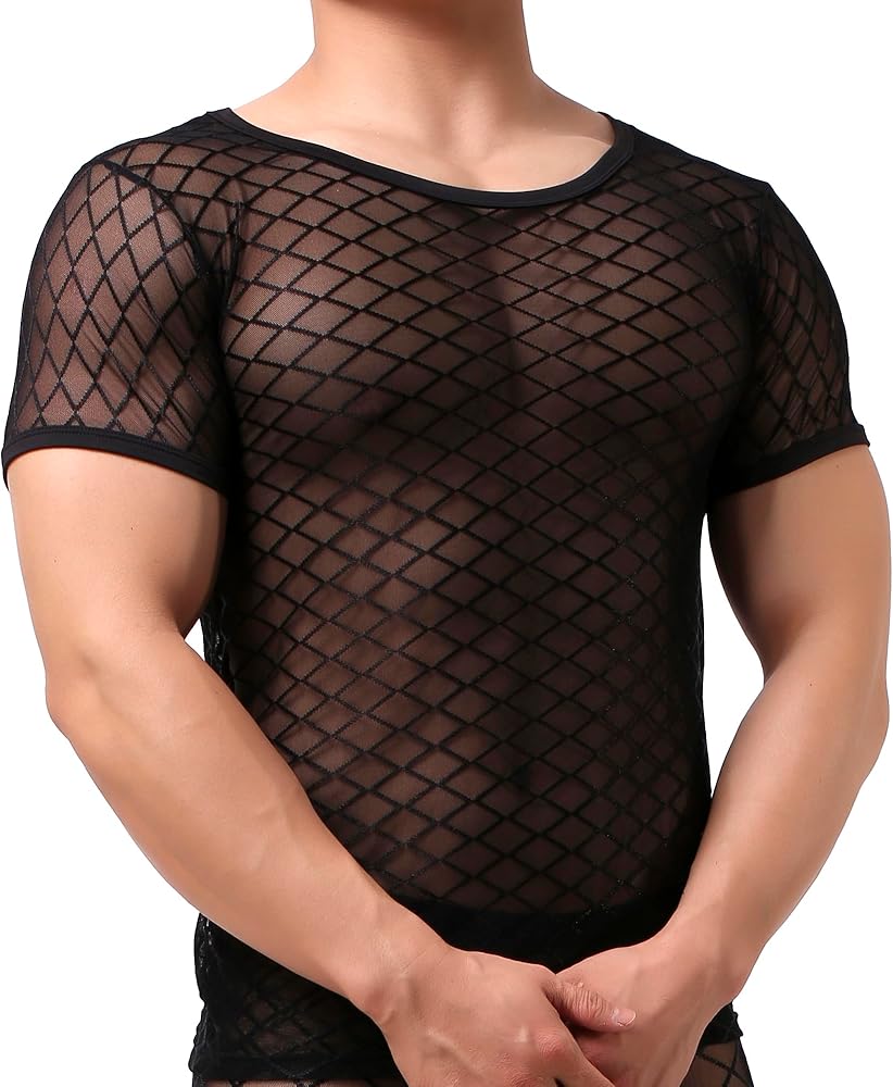 تي شيرت شبكي بأكمام قصيرة للرجال، قميص داخلي مثير بدون أكمام شبكي شفاف شفاف يمكن الرؤية من خلاله