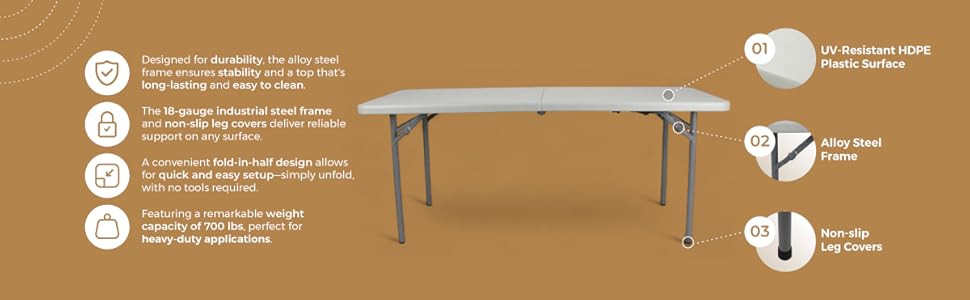 • 【 WHAT SETS OEF FURNISHINGS APART 】 Most “pro” tables take shortcuts—thin tops, awkward leg placements, cramped seating. The OEFCMFIH Series doesn't. Its 1¾" thick blow-molded HDPE top resists sag, scratches, and heat up to 212°F, while the 18-gauge steel end-leg frame keeps the seating area open—no wishbone legs to block chairs or knees. It folds clean in half for transport, locks flat for storage, and delivers industrial-grade durability through years of setups and tear-downs.
