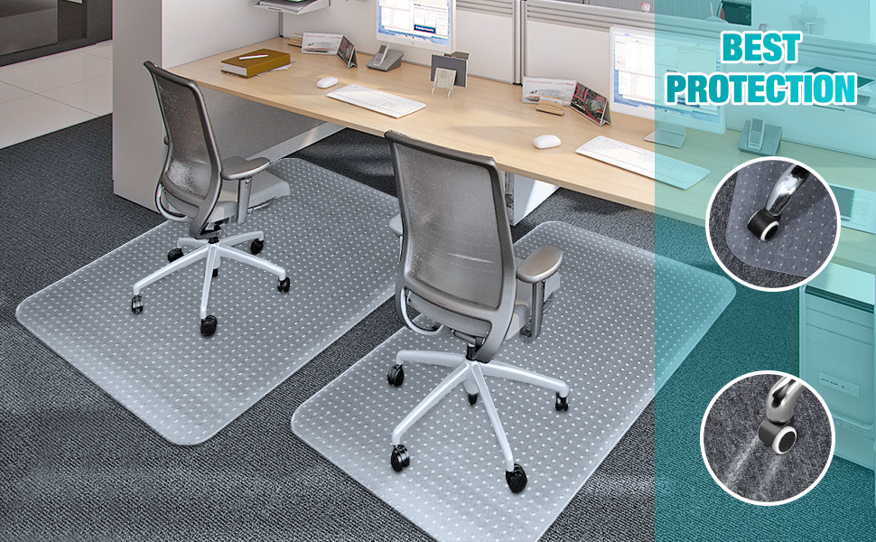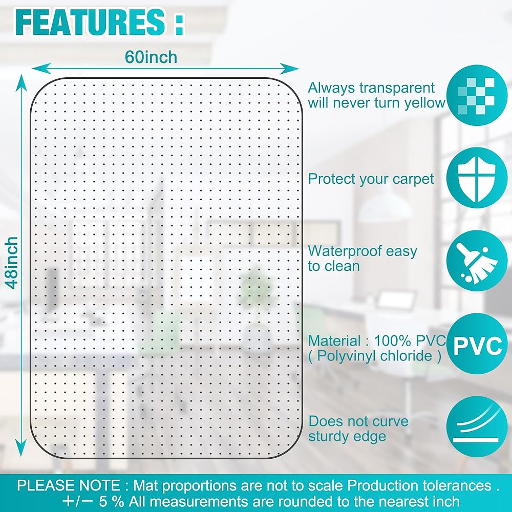 قبضة فعالة: الجانب السفلي المرصع يحافظ على السجادة ثابتة في مكانها على أرضيات السجاد. تم تصميم سجادة الكرسي المكتبي هذه ذات المسامير 3 مم للسجاد ذو الوبر المنخفض والمسطح.
