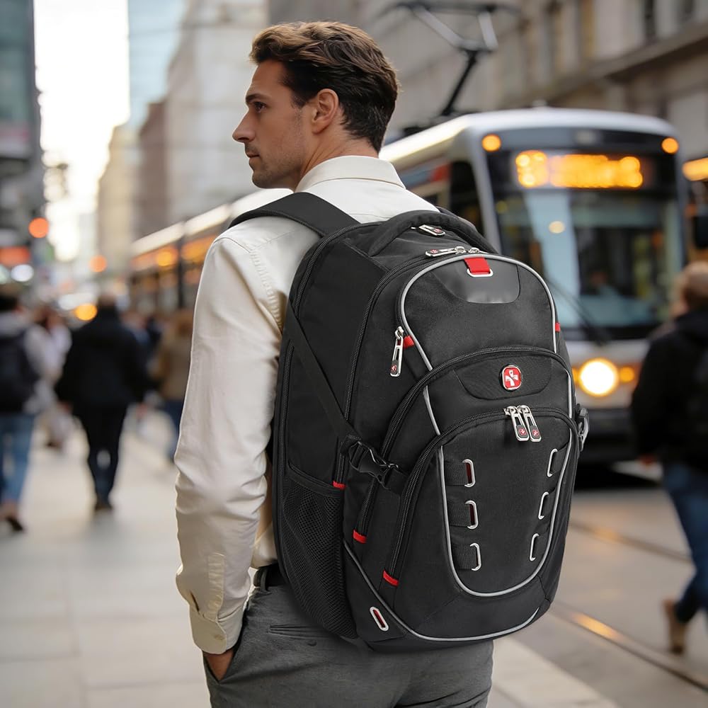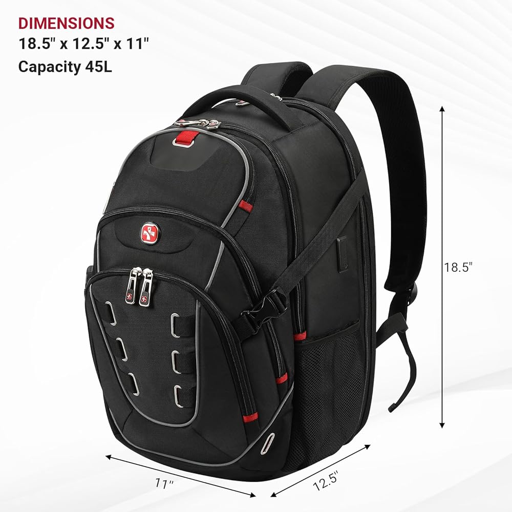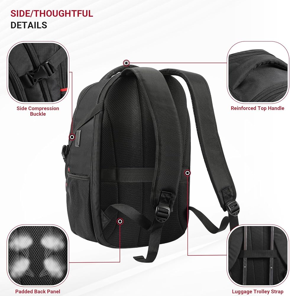 حجرة الكمبيوتر المحمول الصديقة لإدارة أمن المواصلات الأمريكية (TSA) مع حماية معززة - تفتح حجرة حقيبة الظهر المخصصة للكمبيوتر المحمول الصديقة لإدارة أمن المواصلات الأمريكية (TSA) بزاوية 180 درجة لإجراء فحوصات أمنية سلسة في المطار. يشتمل على ثلاثة جيوب ملحقة إلكترونية للهاتف أو بنك الطاقة أو الماوس أو أجهزة التسجيل، وحافظة iPad منفصلة، وحجرة كمبيوتر محمول مبطنة باللون الأحمر تحمي أجهزة الكمبيوتر المحمولة حتى 17.3 بوصة أثناء السفر.