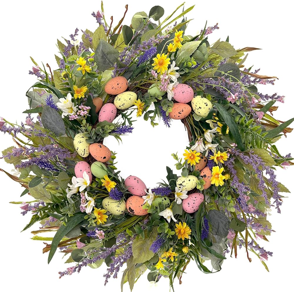 24 Inch Farmhouse Easter Wreath for Front Door, Artificial Pastel Spring Wreaths with Easter Eggs,Lavender&Wildflowers,Handcrafted Wreath for Entryway Mantel Window Indoor Outdoor Decorations