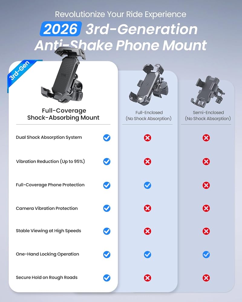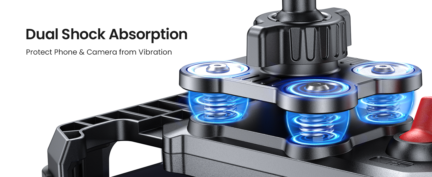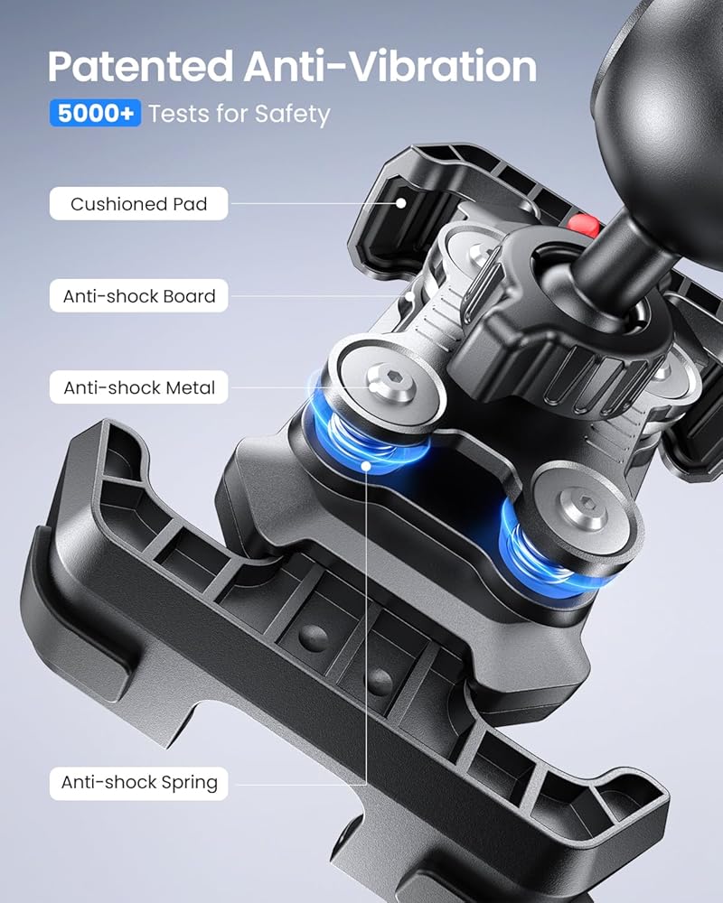 ✅ حاصلة على براءة اختراع لامتصاص الصدمات المزدوج (ترقية الجيل الثالث لعام 2026): قيادة أكثر سلاسة على أي طريق. يستخدم حامل الهاتف للدراجات النارية هذا الجيل الثالث من امتصاص الصدمات المزدوج الحاصل على براءة اختراع لتقليل ما يصل إلى 95% من الاهتزاز، مما يحمي هاتفك والكاميرا من التلف على الأراضي الوعرة أو بسرعات عالية. استمتع بالملاحة الواضحة والثبات القوي بعد ميل.
