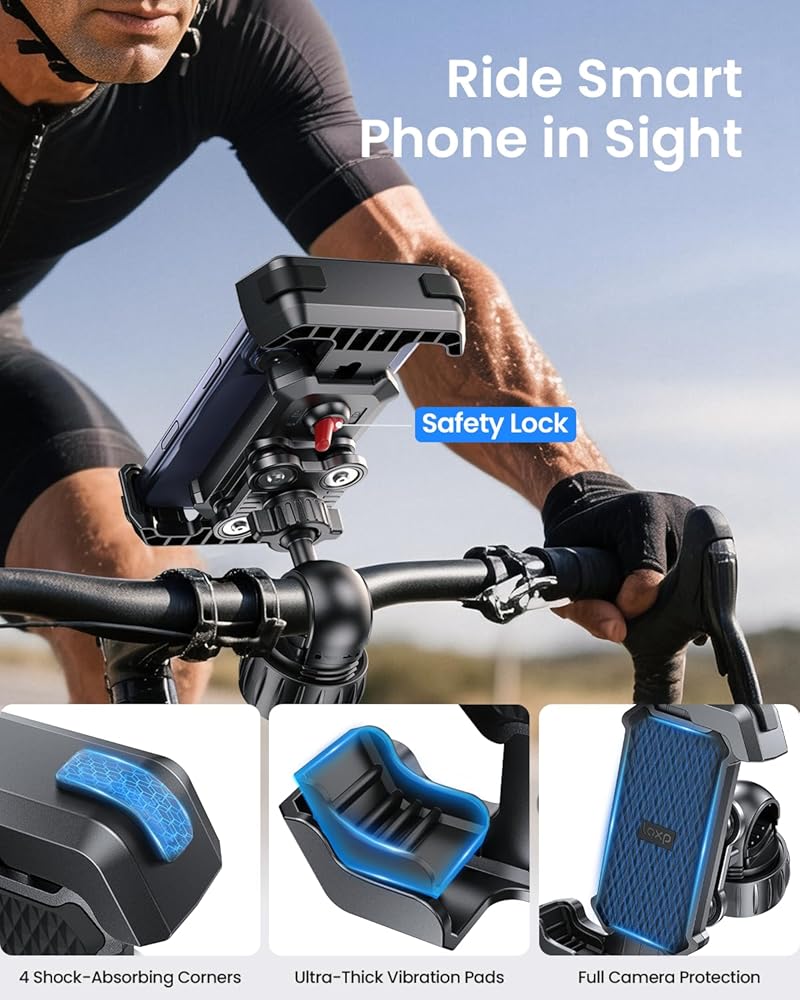 ✅ التثبيت بيد واحدة والتحرير السريع - لا حاجة لأي أدوات: قم بتركيب أو إزالة هاتفك من حامل هاتف الدراجة في ثانية واحدة فقط باستخدام مشبك المقود الذي يعمل بالضغط للقفل. لا توجد أدوات ولا حفر ولا تغييرات دائمة. يحافظ تصميم القفل الآمن على ثبات هاتفك في مكانه أثناء المطبات والمنعطفات والرحلات السريعة، وهو مثالي للراكبين الذين يقومون بتبديل دراجاتهم بشكل متكرر.