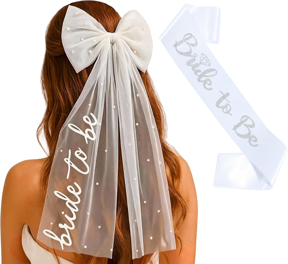 【GLAMOROUS BRIDE VEIL & SASH SET】This set includes an exquisite bow-shaped elongated white tulle veil featuring "Bride to be" in hot-stamped lettering, complete with a metal clip, and a luxurious satin sash adorned with elegant silvery hot-stamped lettering of "Bride to be". An essential accessory for bridal shower decorations, bachelorette party celebrations, or engagement photoshoots