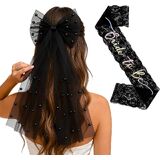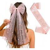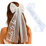 Bride To Be Sash and Bride Veil White for Bachelorette Party, Bach Party Favors Accessory, Embroidered Pearl 2 Tier Bow Veil and "BRIDE" Pearl Sash Set