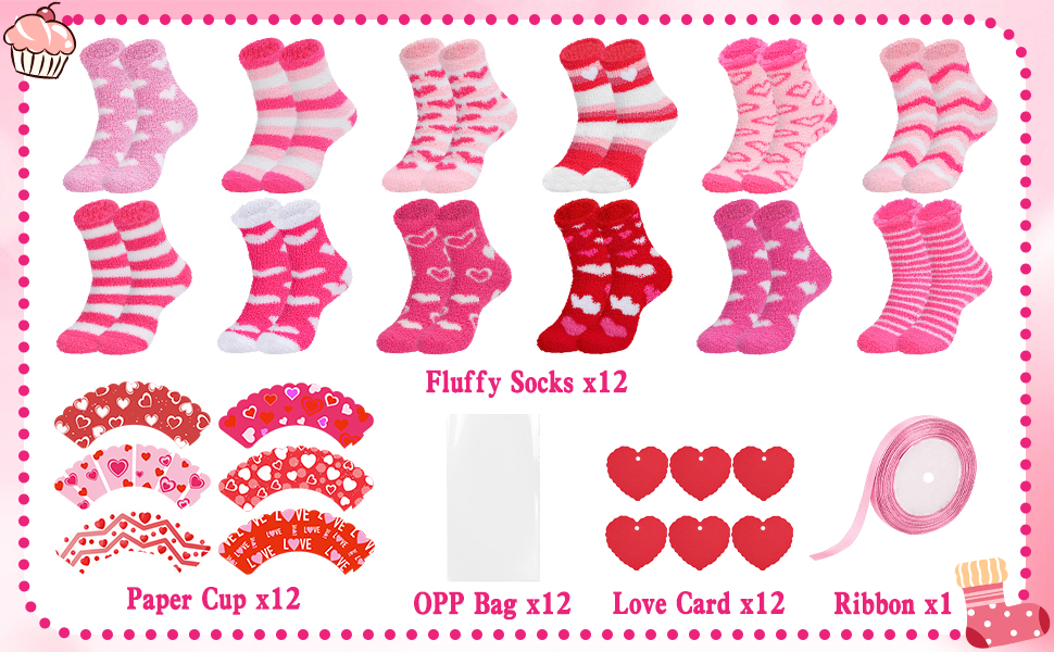 مجموعة جوارب كب كيك: سوف تحصل على 12 زوجًا من جوارب عيد الحب، كل منها يتميز بطبعات فريدة وتفاصيل رومانسية. مقترنة بـ 12 لفافة كب كيك، و12 كيس شفاف من البولي بروبيلين، و12 بطاقة قلب، ولفة من الشريط الوردي، فهي توفر قيمة استثنائية. التصميم الرائع والكمية الكبيرة تلبي تمامًا احتياجات الارتداء اليومي والاستبدال خلال موسم عيد الحب، بينما تكون أيضًا هدية مدروسة للأحباء.