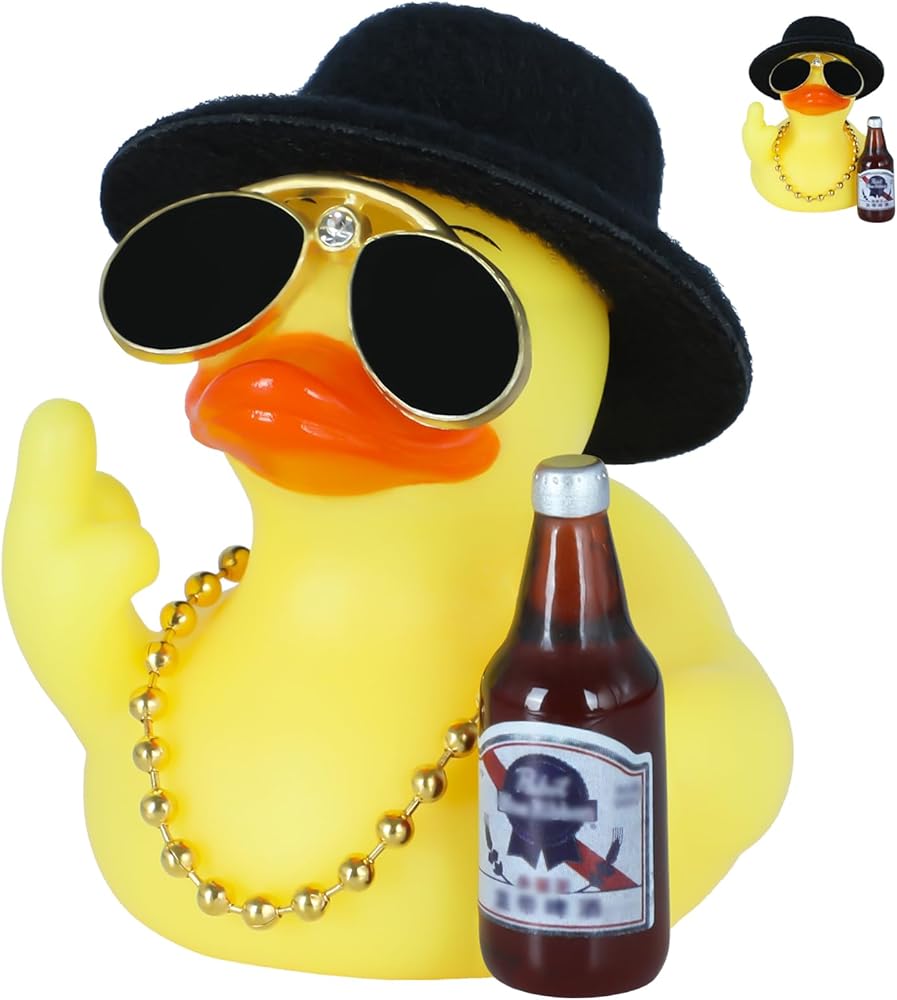 Hilarious Attitude Design – This sassy rubber duck strikes a signature cheeky pose while rocking a black top hat, round sunglasses, and a tiny bottle accessory, adding rebellious humor to your car or desk.