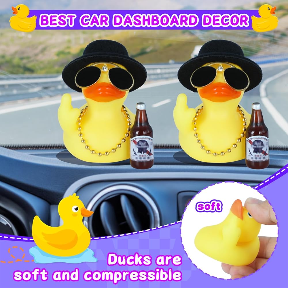 Unleash Playful Rebellion with the Sassy Dashboard Duck! Tired of boring car decor? Meet your new dashboard companion – the ultimate rubber duck with attitude! This silicone troublemaker comes fully accessorized with a sleek black top hat, retro round sunglasses, a bling necklace, and a mini bottle, striking the perfect balance between edgy and adorable. Crafted from premium food-grade silicone, this squishy duck is built to last through road trips, office pranks, and endless giggles. Its iconic, cheeky pose adds a dash of playful humor to brighten your daily commute or workspace, while the removable accessories let you redesign its look daily.