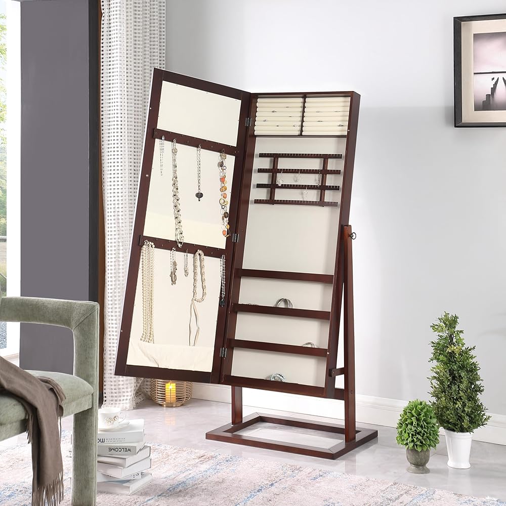 Introducing a versatile 3-in-1 jewelry armoire: a full-length mirror for matching your clothing and jewelry, spacious storage for your finest pieces, and shelves for your skincare and makeup products. Available in white and espresso, its sleek, modern design complements any room. The single-door design allows for quick and easy access to your jewelry, making it simple to coordinate with your outfit. Crafted from high-quality materials, this armoire is sturdy and durable, designed to withstand everyday use.