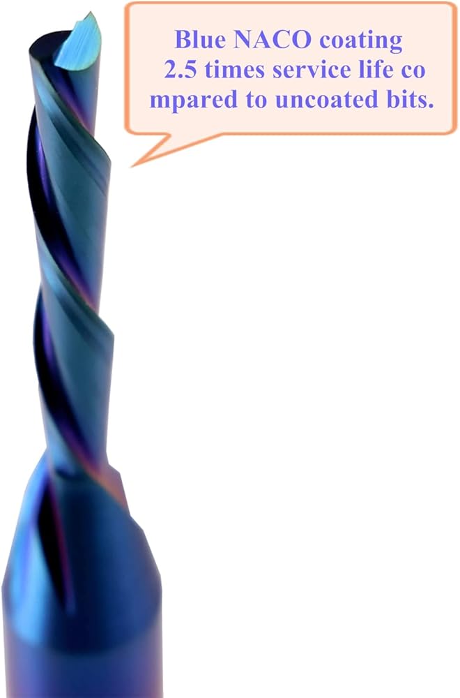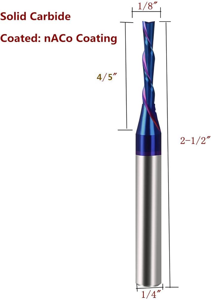 About Xuanfeng Factory :We are a professional factory with 15 years of production history. Our factory philosophy is to provide our customers with: satisfactory quality of use, high work efficiency, and perfect after-sales service. About that product: Cutting Diameter: 1/8" Cutting Length: 4/5" Shank Diameter: 1/4" Overall Length: 2 1/2" Flutes: 2 Down cut endmills shear in a downward direction causing the uppermost layer of the material to be pressed down against the material just below it. This motion leaves a perfectly clean top surface edge. A concentration of wood chips in the work path will occur. Hose away excess wood chips to prevent bit breakage. Pros: Prevents top surface edge chipping and tear-away. Cons: Less than optimal chip removal when dadoing or plunging. (Choose an up cut spiral bit for standard more efficient milling.) For use in CNC milling and carving machines. nACo coating provides longevity and produces cutting results of the highest quality. use for cutting: Laminate, Melamine Particle Board,MDF,Veneered Plywood,Wood for use on CNC, table mount and handheld routers. Warranty For Customers: Quality assurance. if there are any problem with the item please contact us at first, we will offer new item exchange or refund policy. Packing : Dust-free BPA FREE square tube .