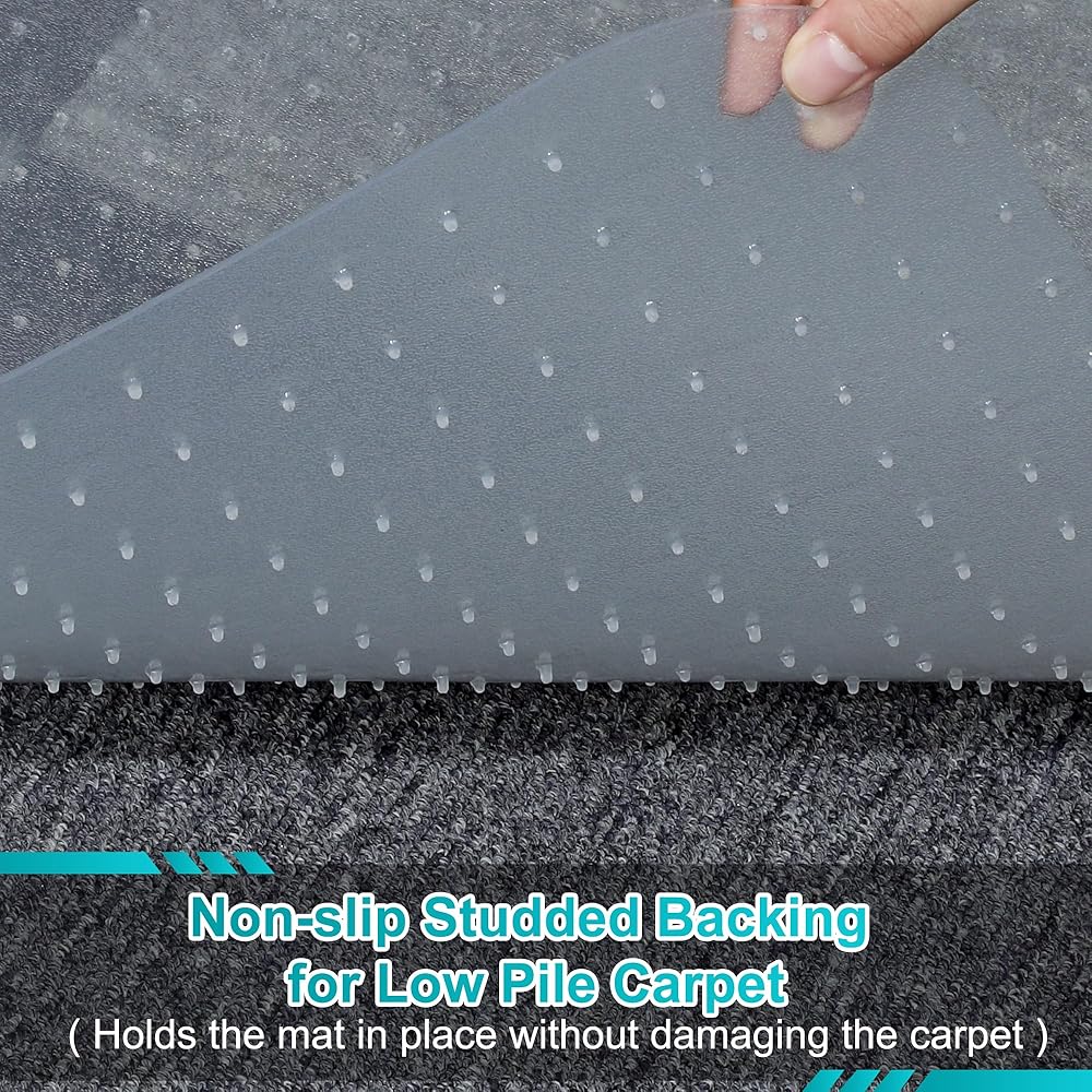 قبضة فعالة: الجانب السفلي المرصع يحافظ على السجادة ثابتة في مكانها على أرضيات السجاد. تم تصميم سجادة الكرسي المكتبي هذه ذات المسامير 3 مم للسجاد ذو الوبر المنخفض والمسطح.
