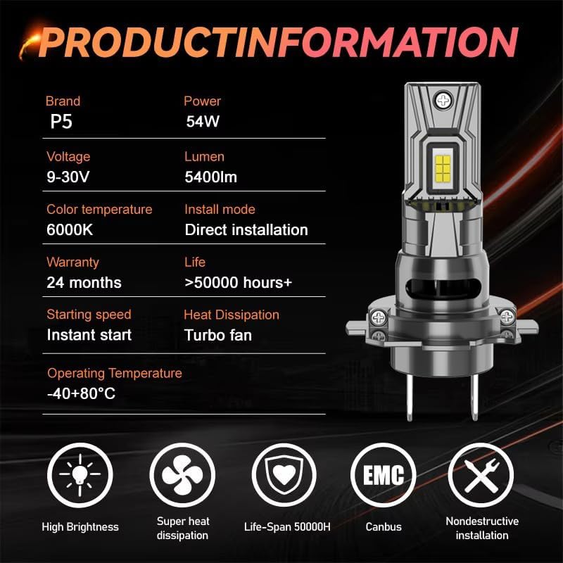 أكثر من 50000 ساعة من العمر: تم تصميم لمبة الضباب H7 لتدوم طويلاً، مع هيكل متين من الألومنيوم الفضائي وتبديد حرارة متكامل، ونظام تبريد يوفر تبديدًا ممتازًا للحرارة ويضمن عمرًا يصل إلى 50000 ساعة.