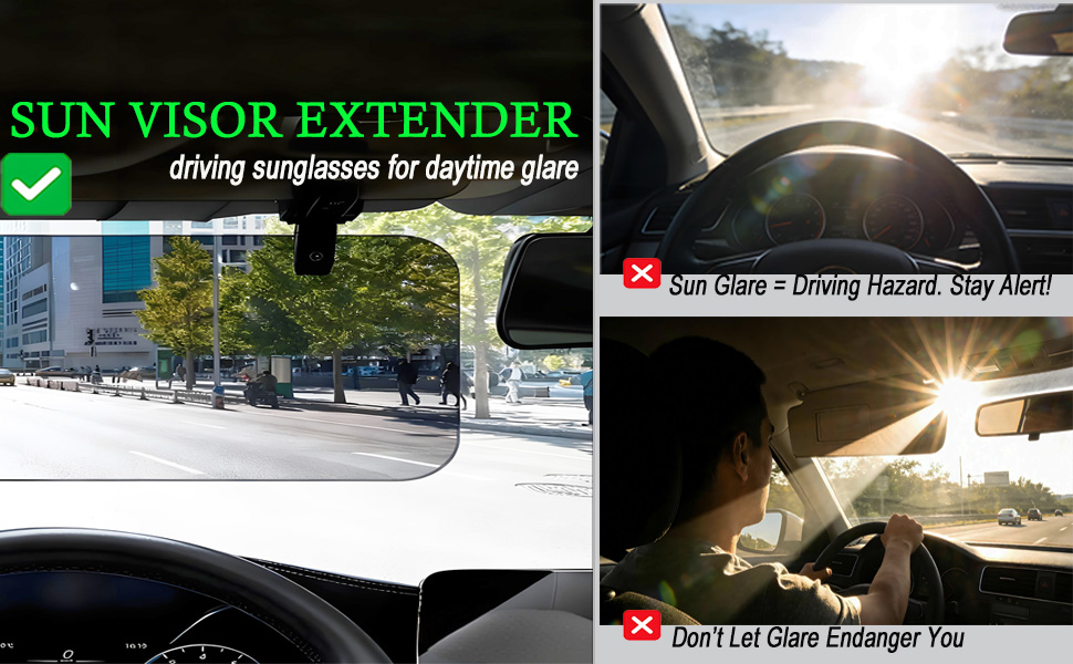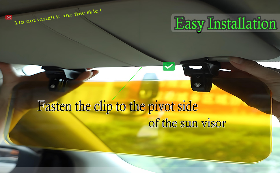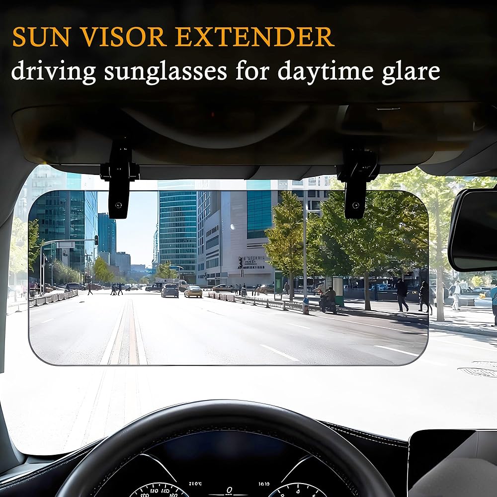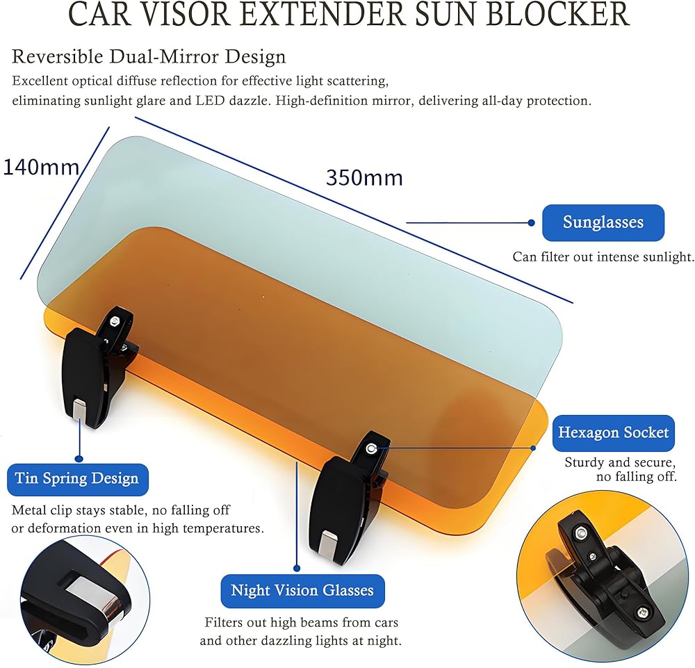 موسع واقي الشمس للسيارة مع عدسات مزدوجة النهار والليل: عدسات مستقطبة رمادية تحجب وهج الشمس والأشعة فوق البنفسجية 400 للقيادة النهارية، عدسة صفراء اللون تقلل من وهج المصباح الأمامي للقيادة الليلية، نظام قلاب يسمح بالتبديل السريع بين الأوضاع