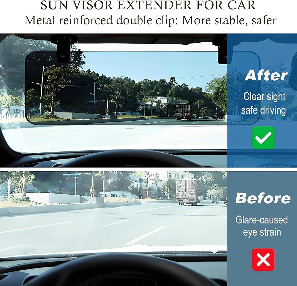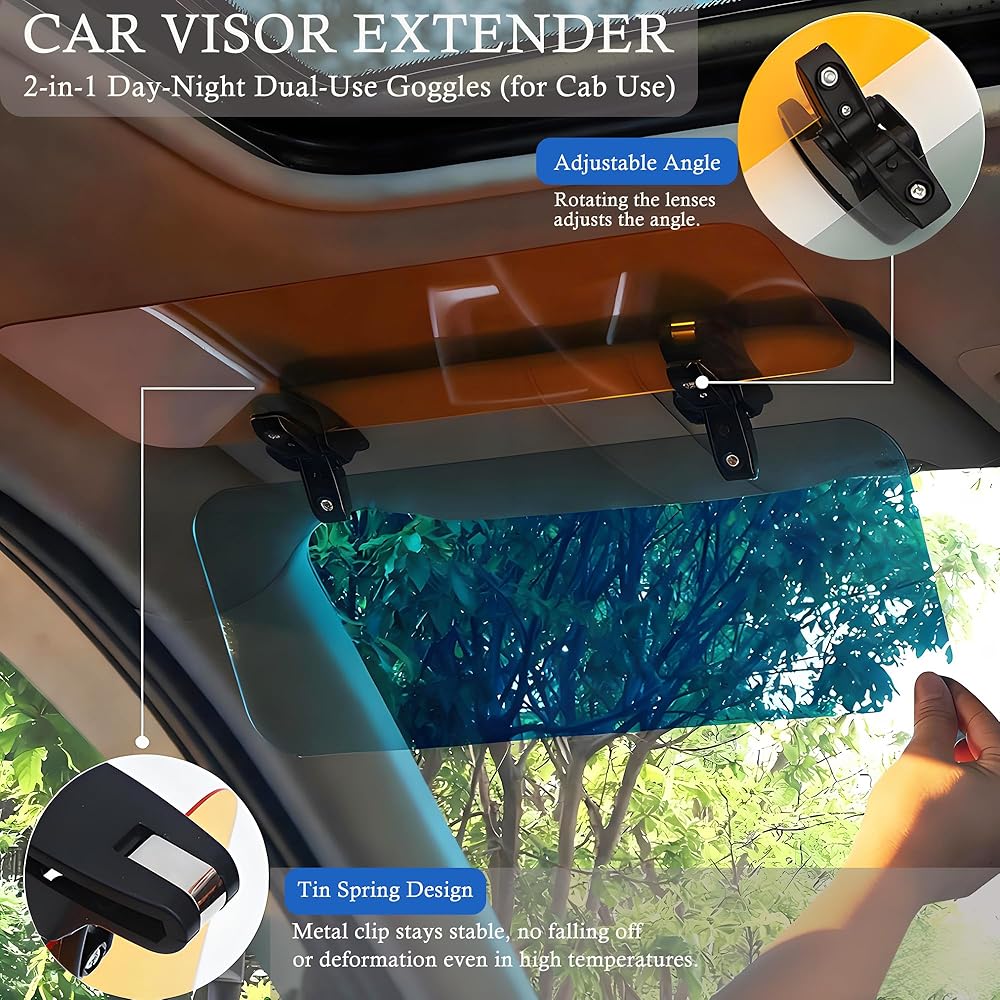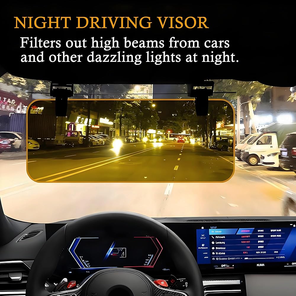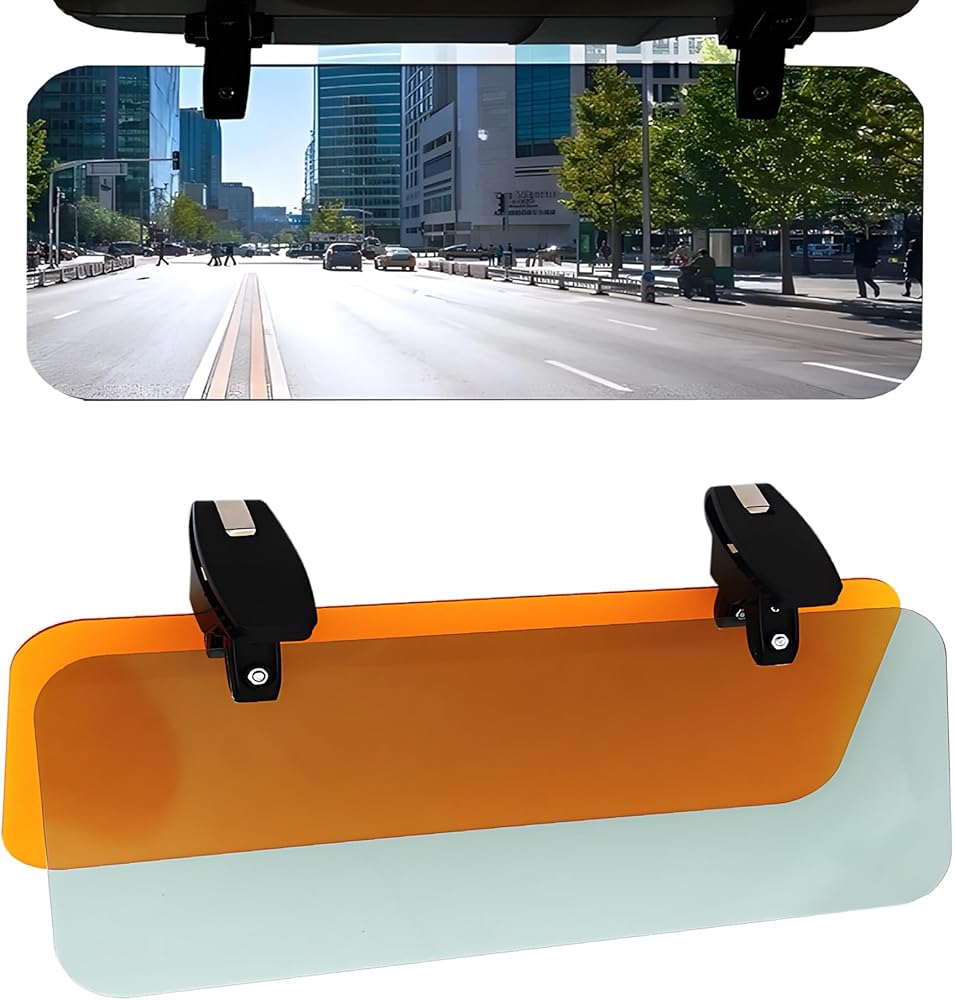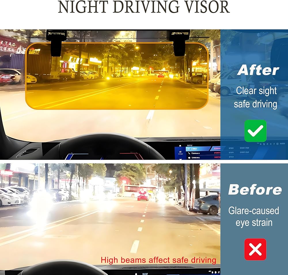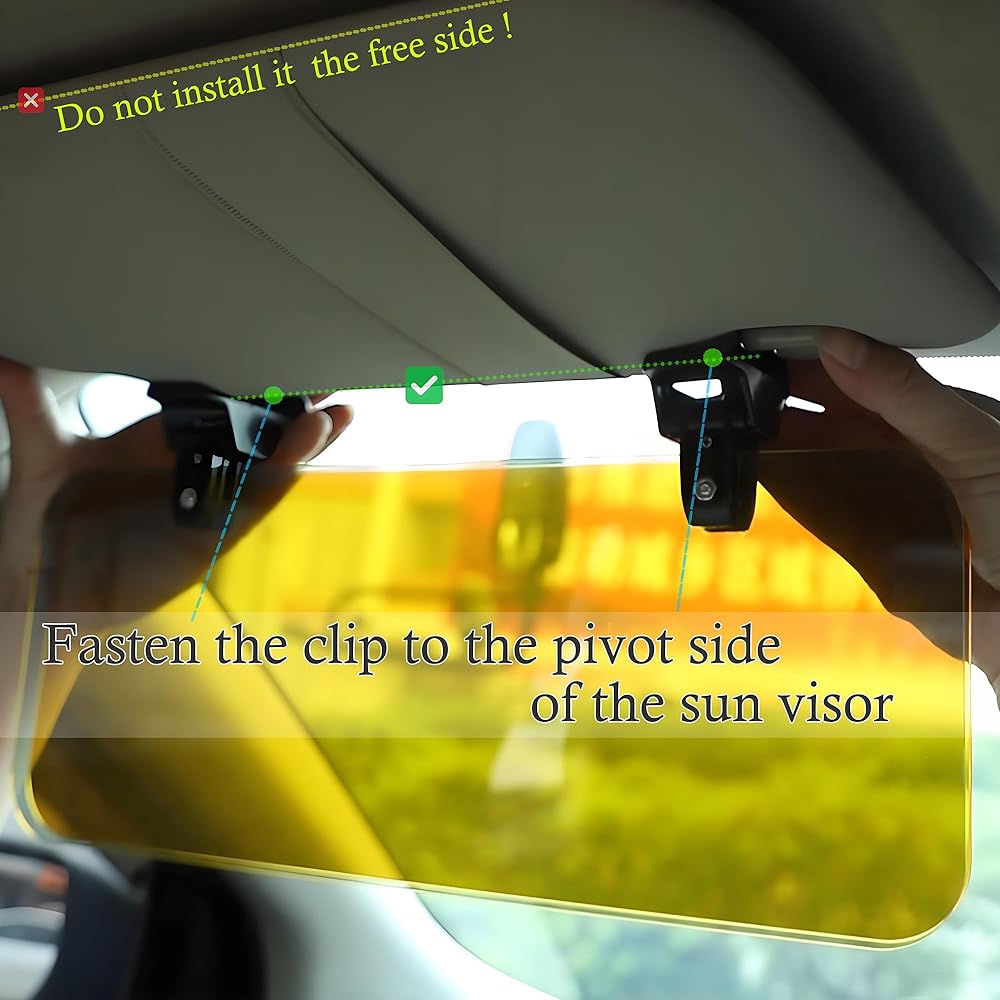 وصلة حماية من الشمس مزدوجة الوظائف لجميع ظروف القيادة: حاجز الشمس المستقطب باللون الرمادي يمنع أشعة الشمس القاسية والوهج المنعكس، العدسات الصفراء تعزز التباين في الإضاءة المنخفضة، واقي الشمس الأساسي لسلامة السيارة أثناء التنقل ليلاً ونهارًا.