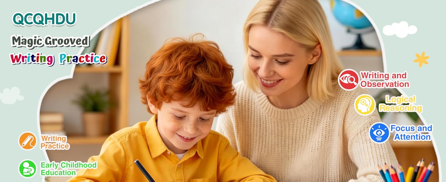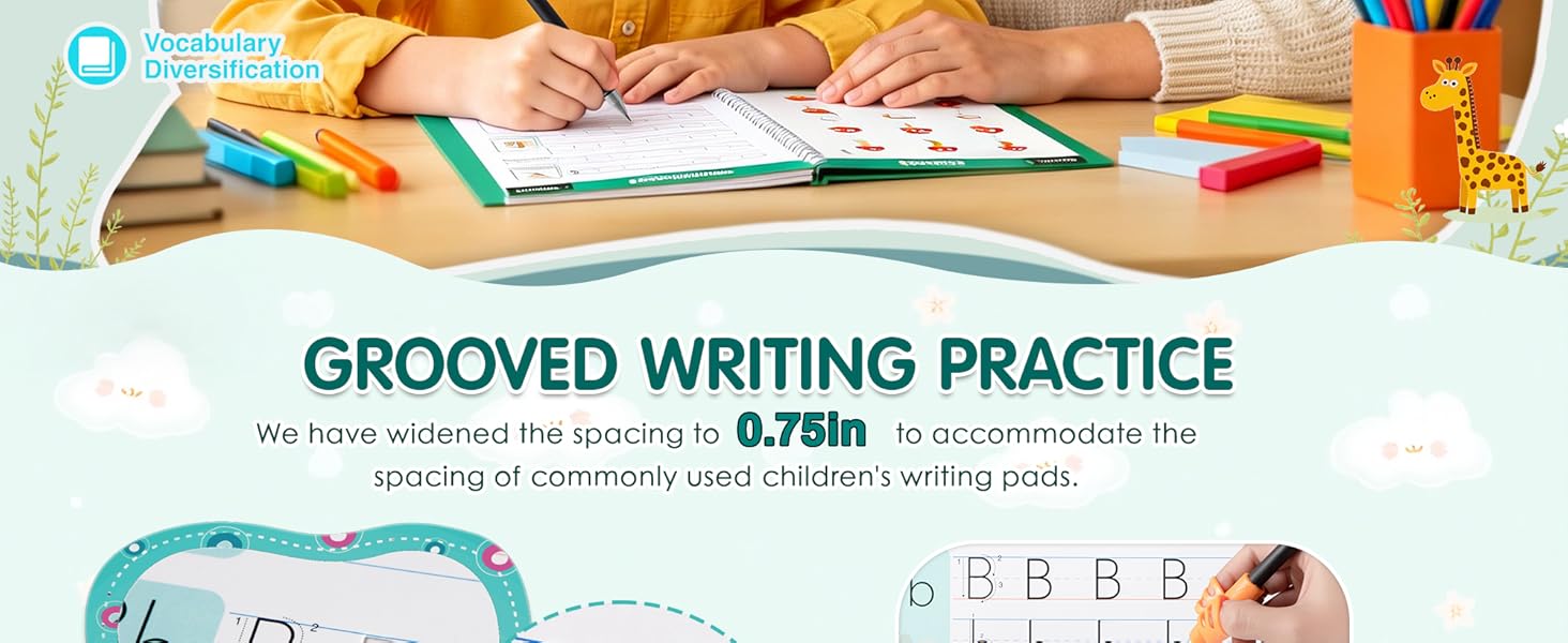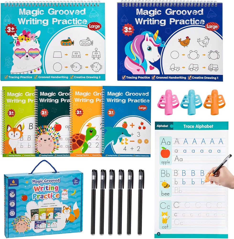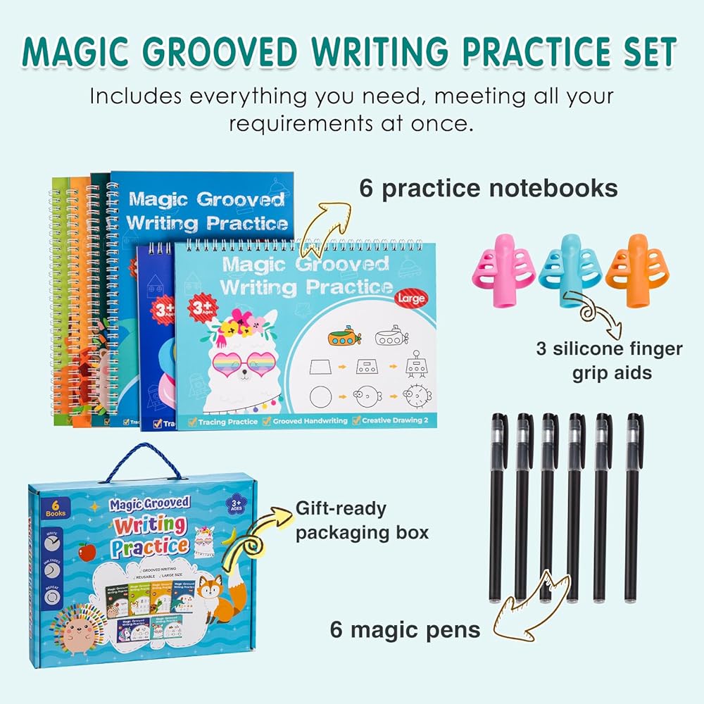 【Upgraded Wider & Deeper Groove Design – Master Writing Basics Faster】Magic grooved handwriting set preschool and kindergarten. Core upgrade: wider writing columns (no cramped space) and deeper grooves (no line straying). Grooved lines guide correct tracing of letters, numbers and lines, helping kids pick up proper pen-holding quickly. All-in-one set: 6 magic grooved workbooks , 6 Disappearing Ink Pens & 3 Grip learning Tools