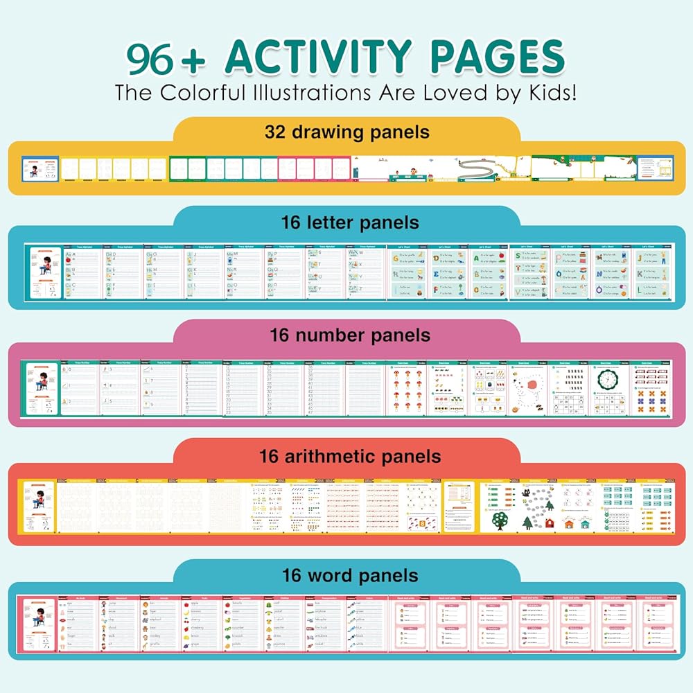 【96 Fun Learning Activities – Boost Cognitive Skills All-Around】6 large reusable grooved workbooks with 96 fun activities. Covers ABCs, drawing, math, numbers and words. Great for preschool and kindergarten: keeps kids focused, sharpens cognitive skills, makes learning fun. Kids master writing, math and drawing via grooved tracing. A must-have for homeschool preschoolers to improve handwriting.