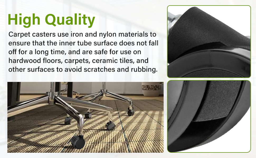 • جودة عالية: تستخدم عجلات السجاد مواد الحديد والنايلون لضمان عدم سقوط سطح الأنبوب الداخلي لمدة خمس سنوات، وهي آمنة للاستخدام على الأرضيات الصلبة والسجاد والبلاط السيراميكي والأسطح الأخرى لتجنب الخدوش والاحتكاك.