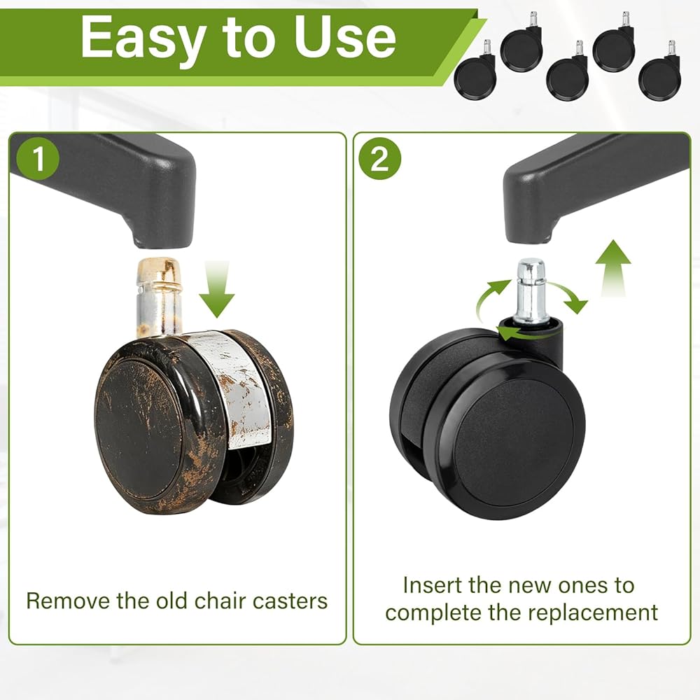 • سهل التركيب: هذا المنتج سهل التركيب ولا يتطلب أدوات. ما عليك سوى إزالة عجلات الكرسي القديمة وإدخال العجلات الجديدة لإكمال عملية الاستبدال. الخطوات بسيطة، مما يضمن التثبيت الآمن وتوفير الوقت والجهد.