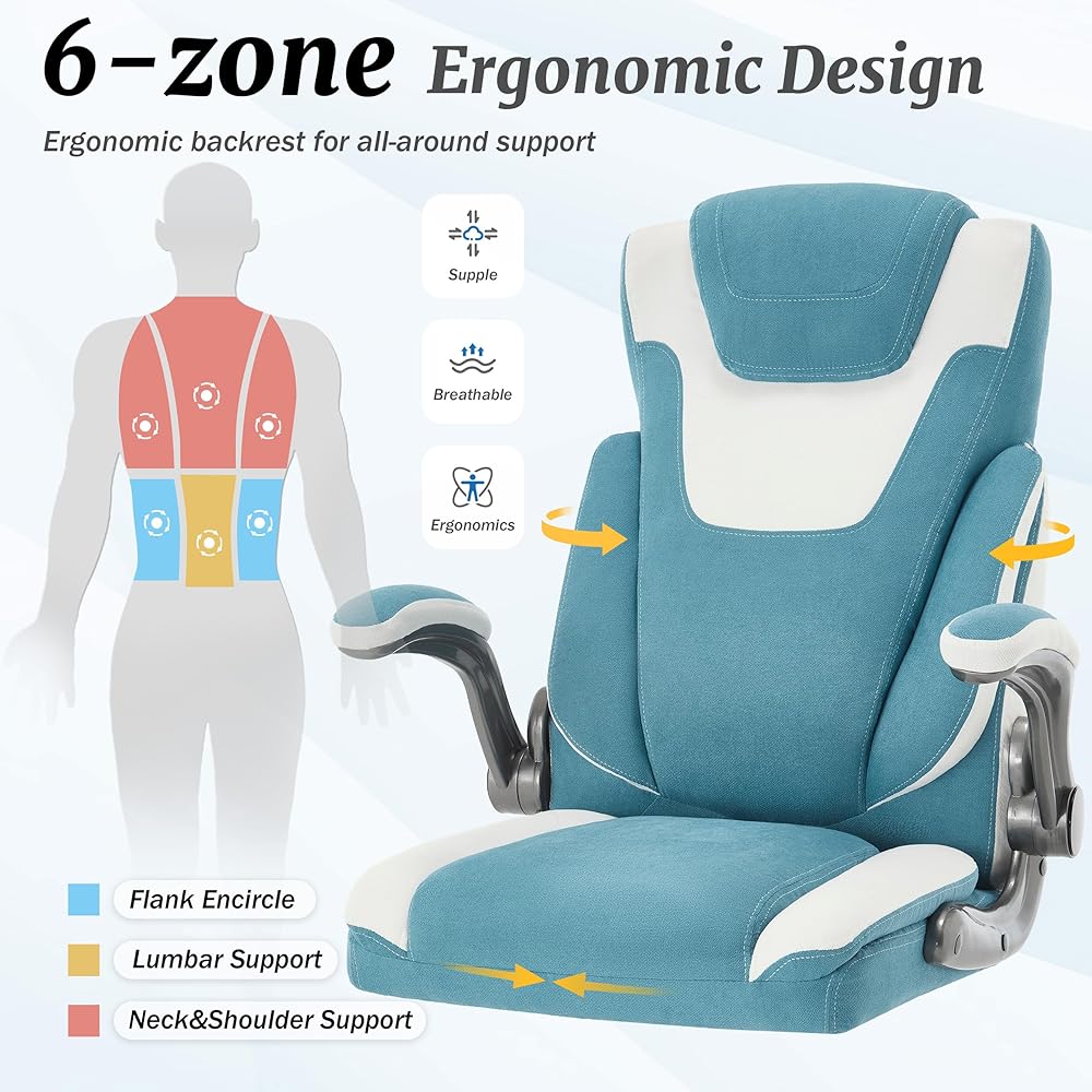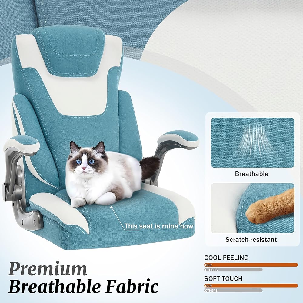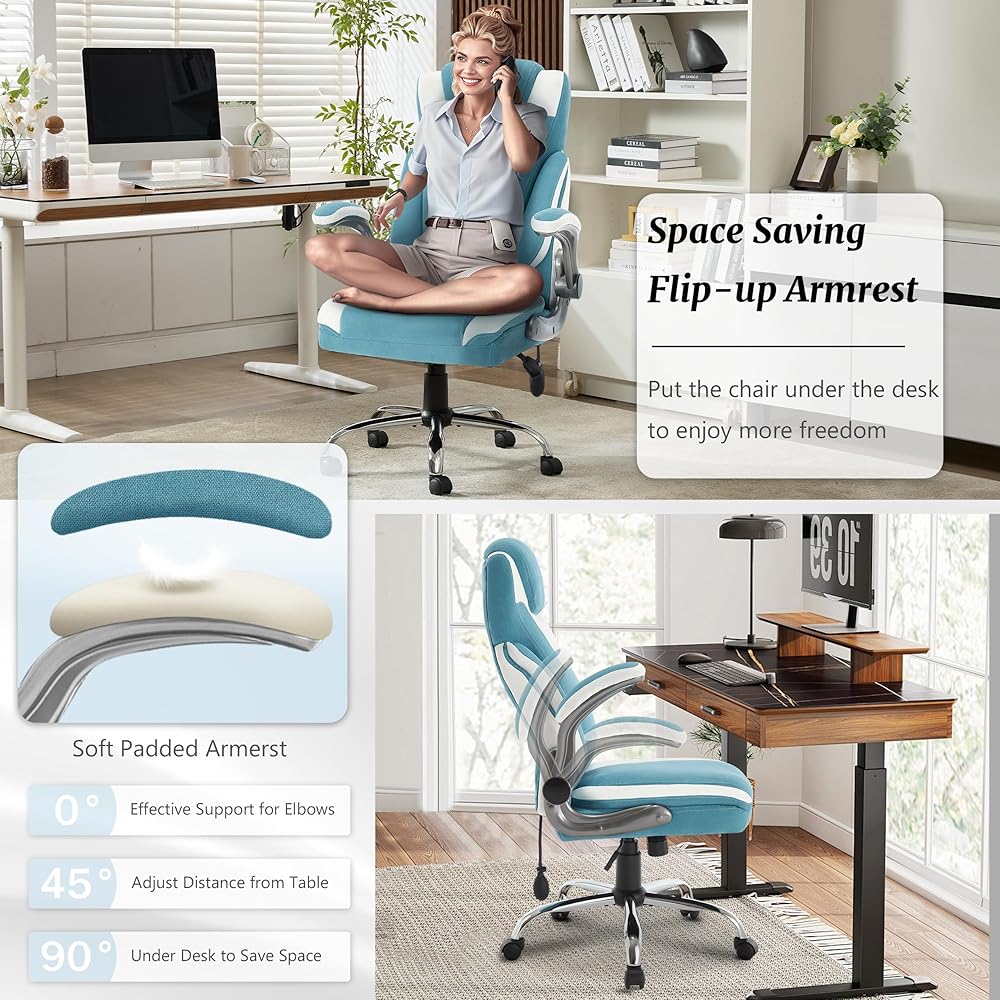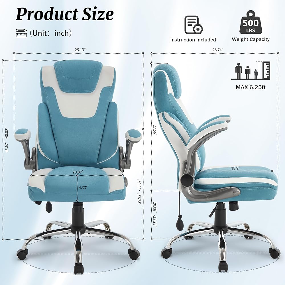 Big and Tall Fabric Office Chair 500LBS with Adjustable Lumbar Support, Extra Wide Seat for Heavy Duty Executive Desk Chair,Breathable Ergonomic Rocking Game Chair Padded Flip-up Armrests,Bluewhite