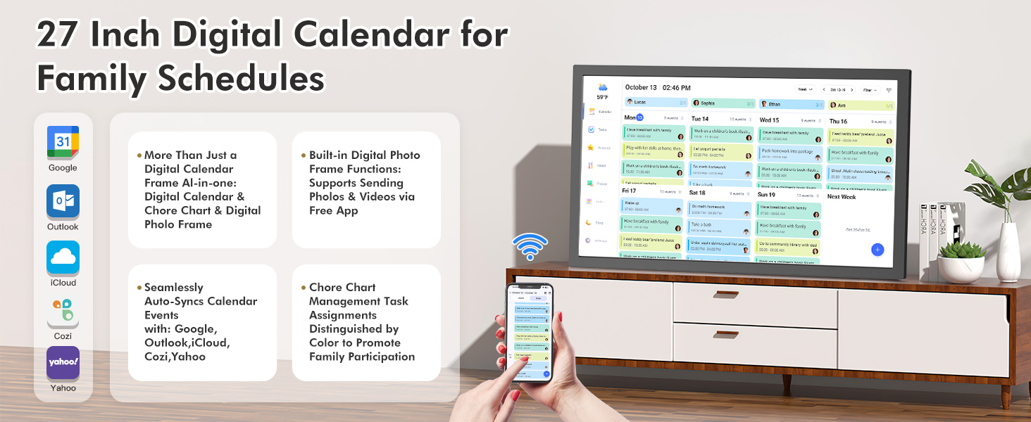【Easy Setup & Auto-Sync WIFI Calendar】: Once get this 27 inch digital family calendar, just plug in, set language, connect to WIFI, select right time zone, name your frame, then link smart digital planner with phone via eCalendar app in minutes. Finally you can seamlessly auto syncs events, photos, videos from phone to WIFI chore chart anytime anywhere as you want, even on the go. Digital calendar planner the preferred choice for busy families. Quite convenient even for grandma, grandpa.