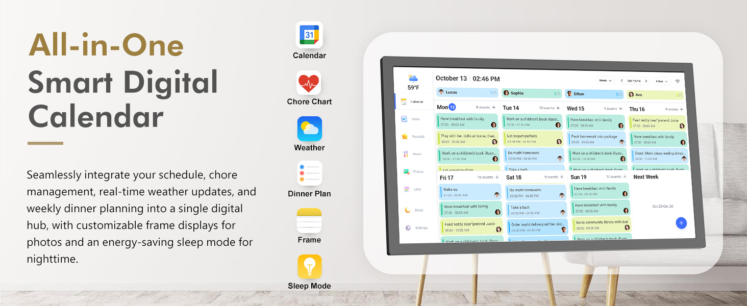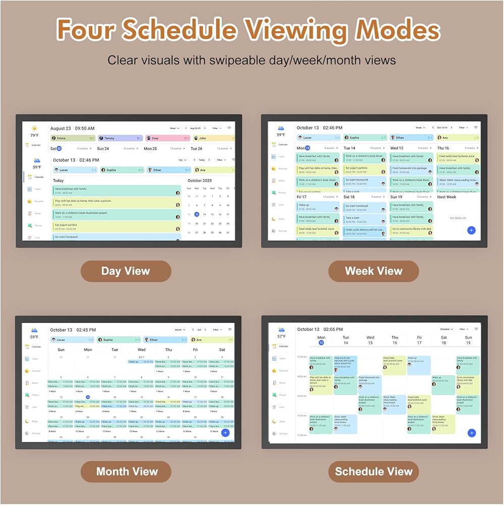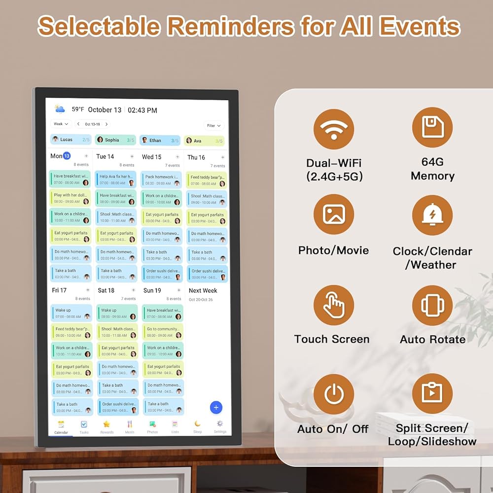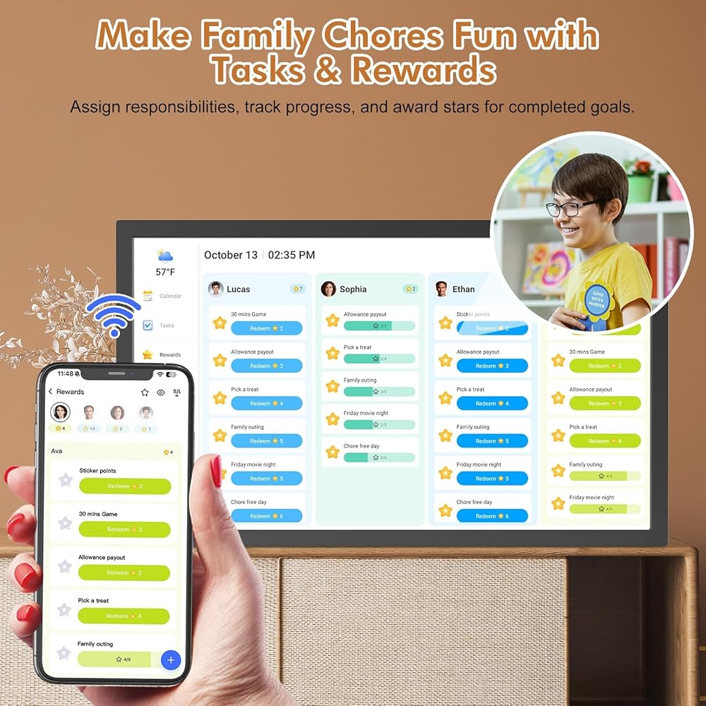 【Digital Chore Chart & Reward System】: The digital family calendar touchscreen assigns chores to each family member with a fun and easy-to-use family chore chart app! Everyone is assigned a unique color and can customize their own avatar for a personalized experience. Family members earn points by completing chore charts, making responsibilities both rewarding and motivating. Assign chores with set times and reminders to keep the whole family in sync.