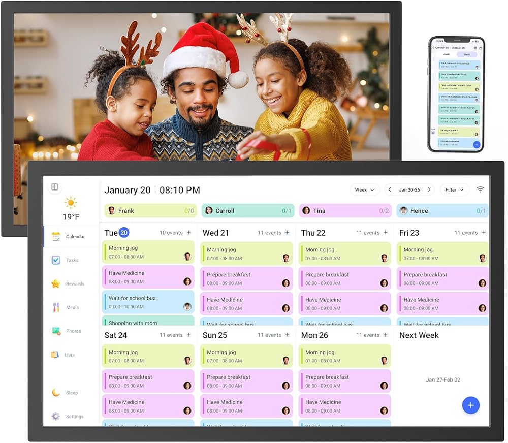 【All-In-One Smart Digital Calendar】: This large electronic calendar combines digital calendar, smart chore chart, digital photo frame, habit tracker, meal planner alarm clock on one 27 inch touch screen customized dashboard that seamlessly help organize and track every family, learning, sport or office schedule easily. Our smart digital calendar assign different colors and tasks to each members, so that everyone know their own duty very well, makes life simple and organized.