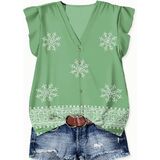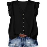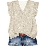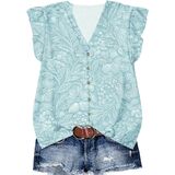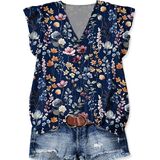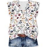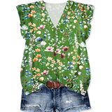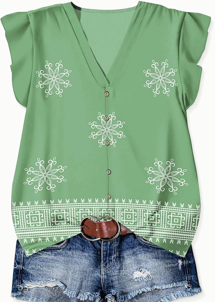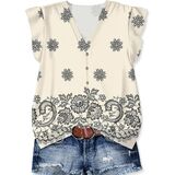 • تصميم انسيابي وأنثوي: يتميز هذا القميص الانسيابي بتصميم ساحر بأكمام قصيرة مكشكش وطباعة زهور رقيقة، مما يخلق مظهرًا أنثويًا ورومانسيًا دون عناء ومثالي لأجواء بوهو