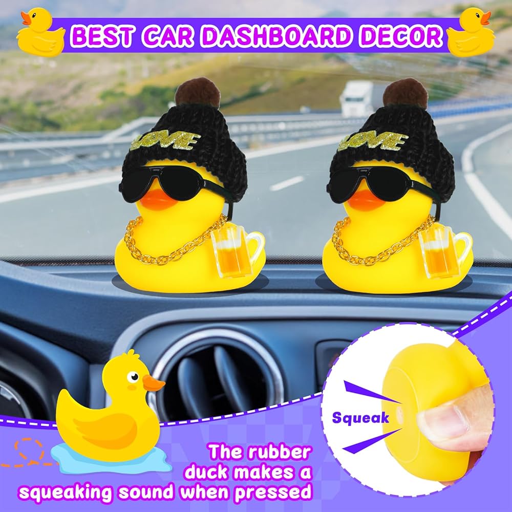 Funny Rubber Duck Car Accessories with Black Love Hat, Sunglasses, Golden Necklace & Beer Mug - Silicone Car Dashboard Decor, Squeezable Squeaky Duck for Stress Relief Car Interior Decoration