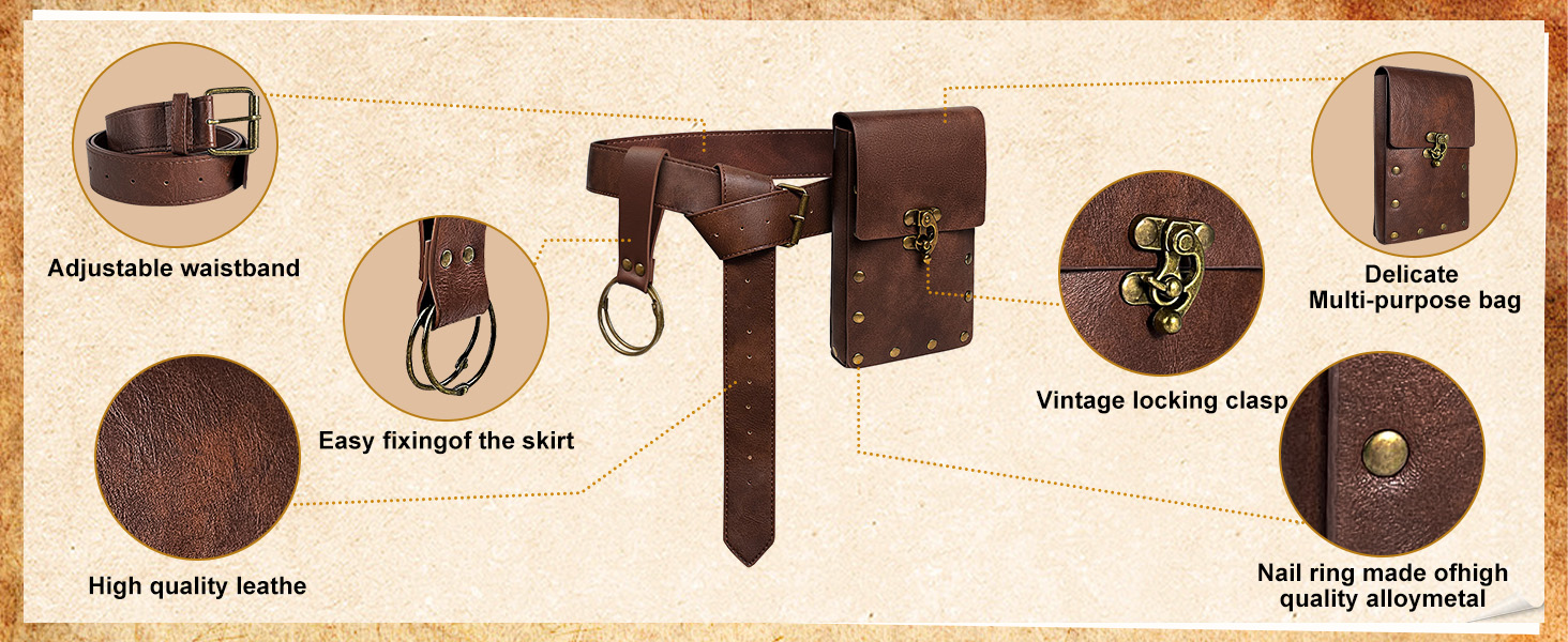 مناسب لجميع أنواع الحفلات: حزام إكسسوارات عصر النهضة مناسب لمختلف المناسبات، مثل LARP، وحفلات عصر النهضة، والمشي لمسافات طويلة، وحفلات الهالوين، وحفلات لعب الأدوار، واللعب كقرصان / ساحر / ساحرة أو محارب، والحفلات ذات الطابع الخاص، والعروض المسرحية، والتقاط الصور الدعائم، وأداء المسرح، وحفلات أعياد الميلاد، والحدث الخيالي وما إلى ذلك.