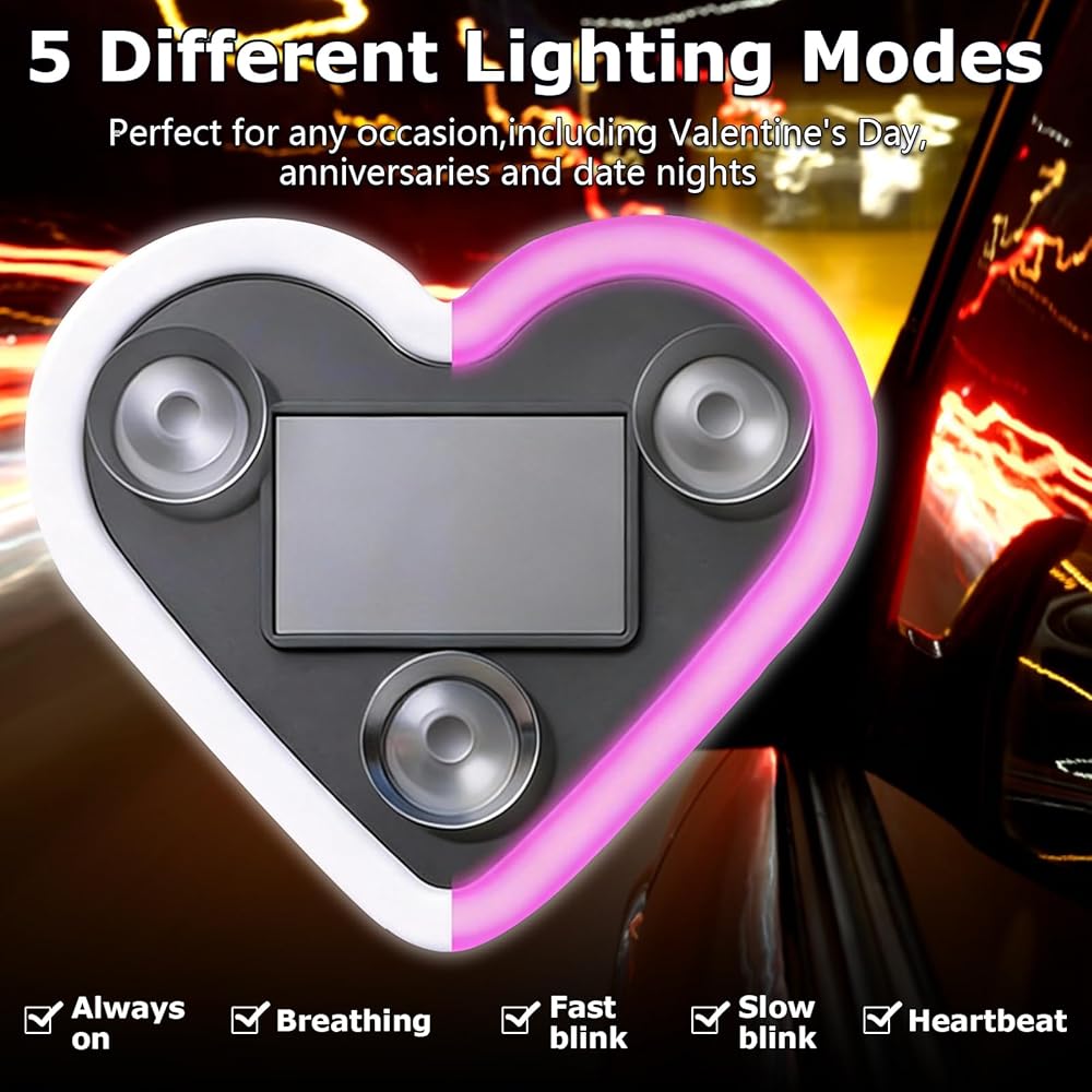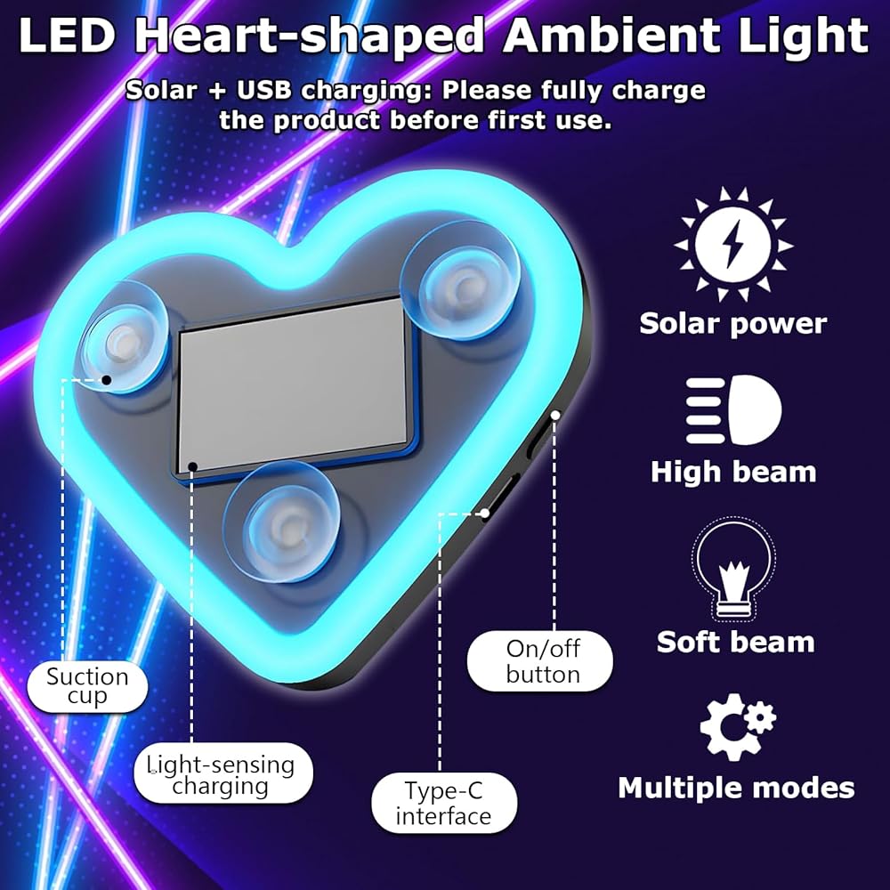 تصميم رومانسي على شكل قلب: قلب رومانسي يعمل بالطاقة الشمسية للسيارة يتميز بتصميم ضوء نيون LED على شكل قلب، ينبعث منه ضوء دافئ وناعم، ويضيف لمسة رومانسية ويعزز أجواء مساحة القيادة الخاصة بك.