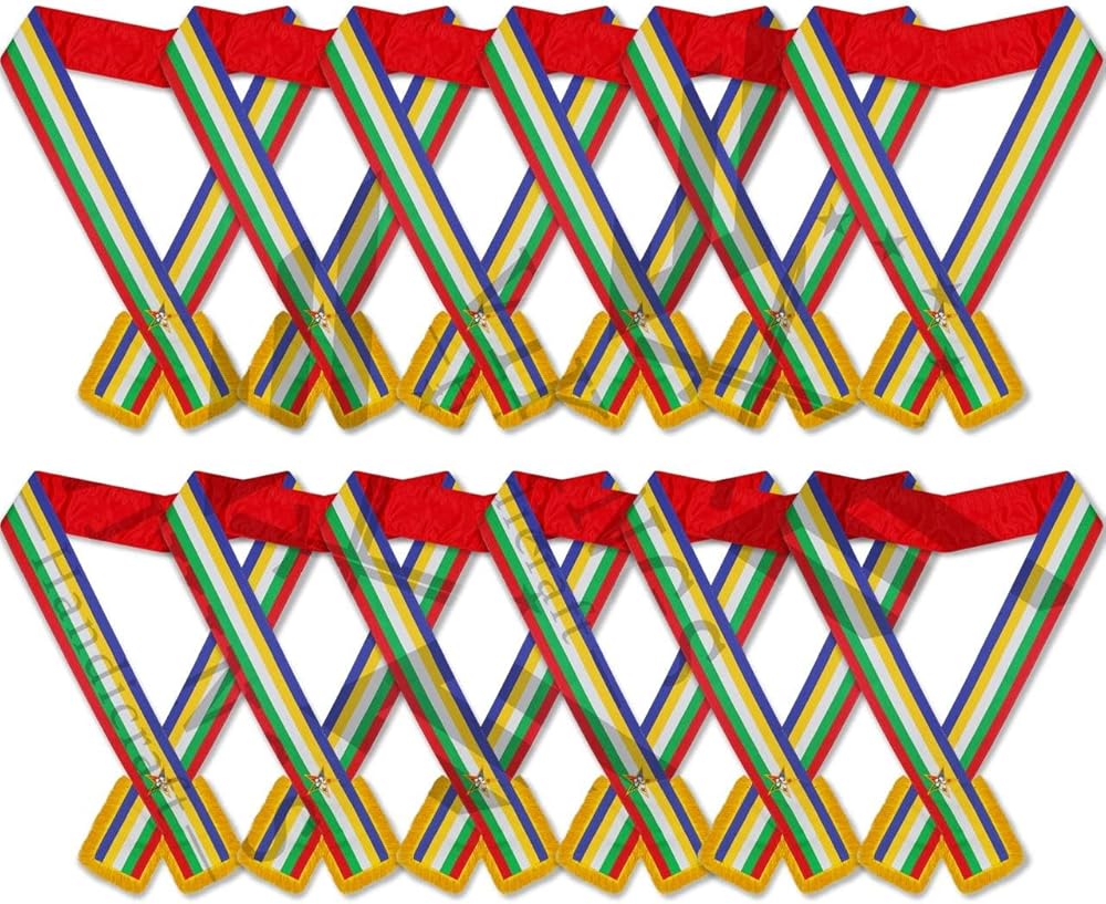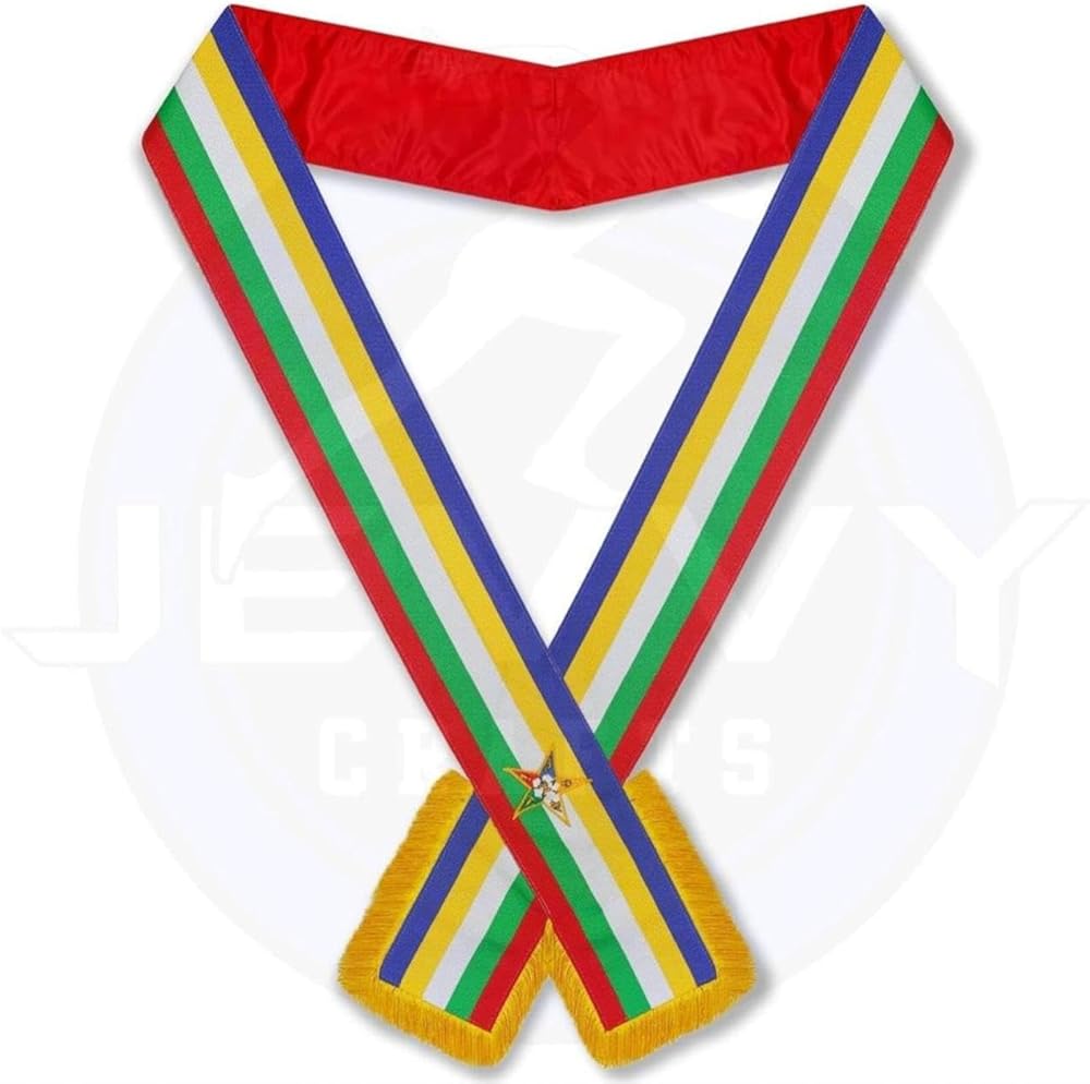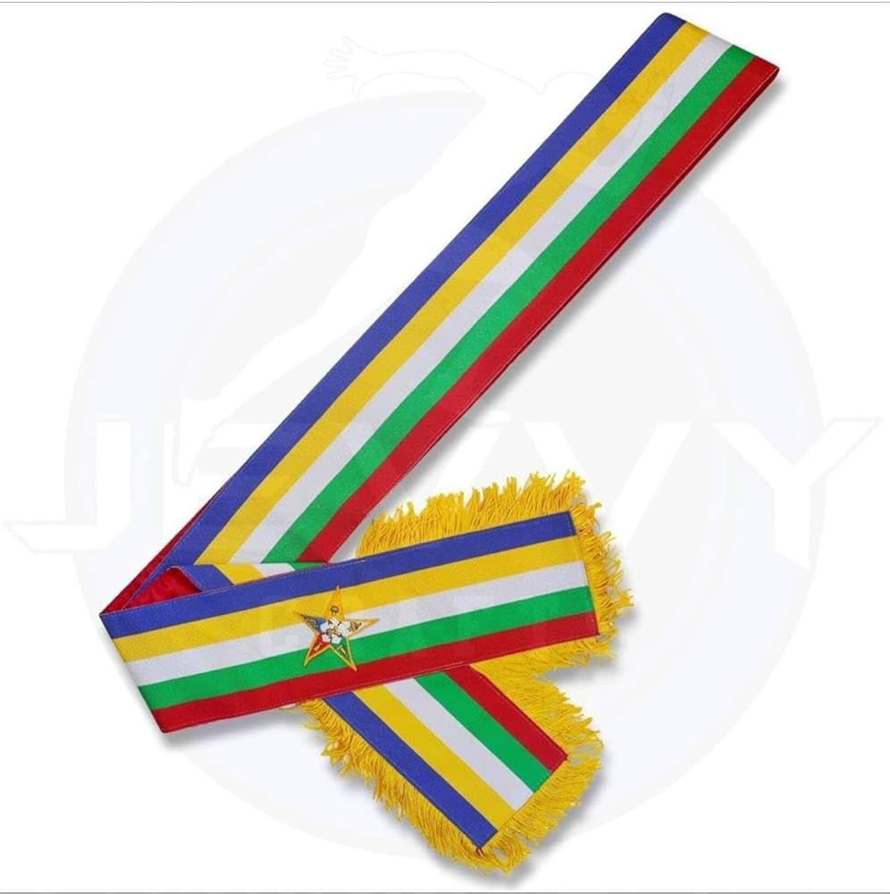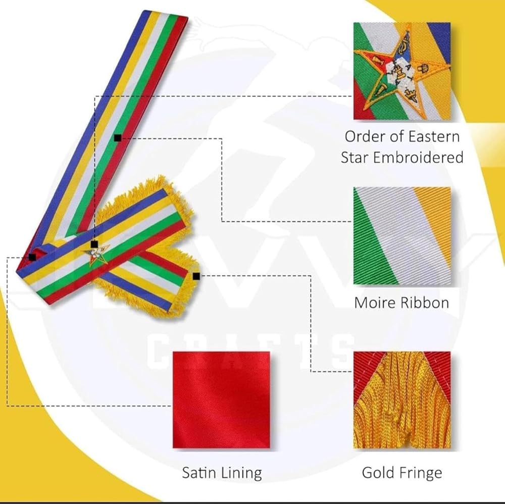 Outfit your Eastern Star chapter with this bulk set of 12 Masonic ceremonial sashes, specially made for official OES gatherings, installations, and lodge events. Each sash is expertly constructed with rich red satin fabric and adorned with five traditional ribbon stripes—blue, yellow, white, green, and red—symbolizing the sacred tenets of the Order of the Eastern Star. At the center, a finely embroidered five-point star patch proudly represents the values of fidelity, constancy, loyalty, faith, and love. These regalia sashes measure 42.5 inches in total length and 4 inches wide, allowing flexibility for wear on either shoulder. Finished with a 1-inch golden fringe, they offer both elegance and symbolic integrity. Each sash weighs approximately 180 grams, providing a balanced drape and premium feel. Your order is shipped in a professionally packed corrugated box (14.25” x 9.25” x 3.25”), internally wrapped for added protection—perfect for transporting and storing ceremonial lodge accessories. Whether you're replacing older regalia or preparing your officers for an upcoming event, this set delivers professional presentation and ceremonial pride.