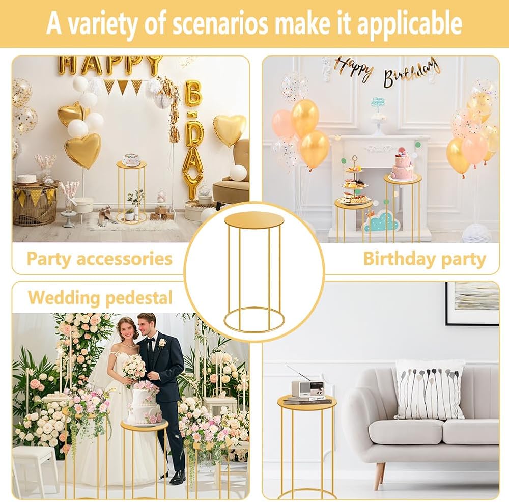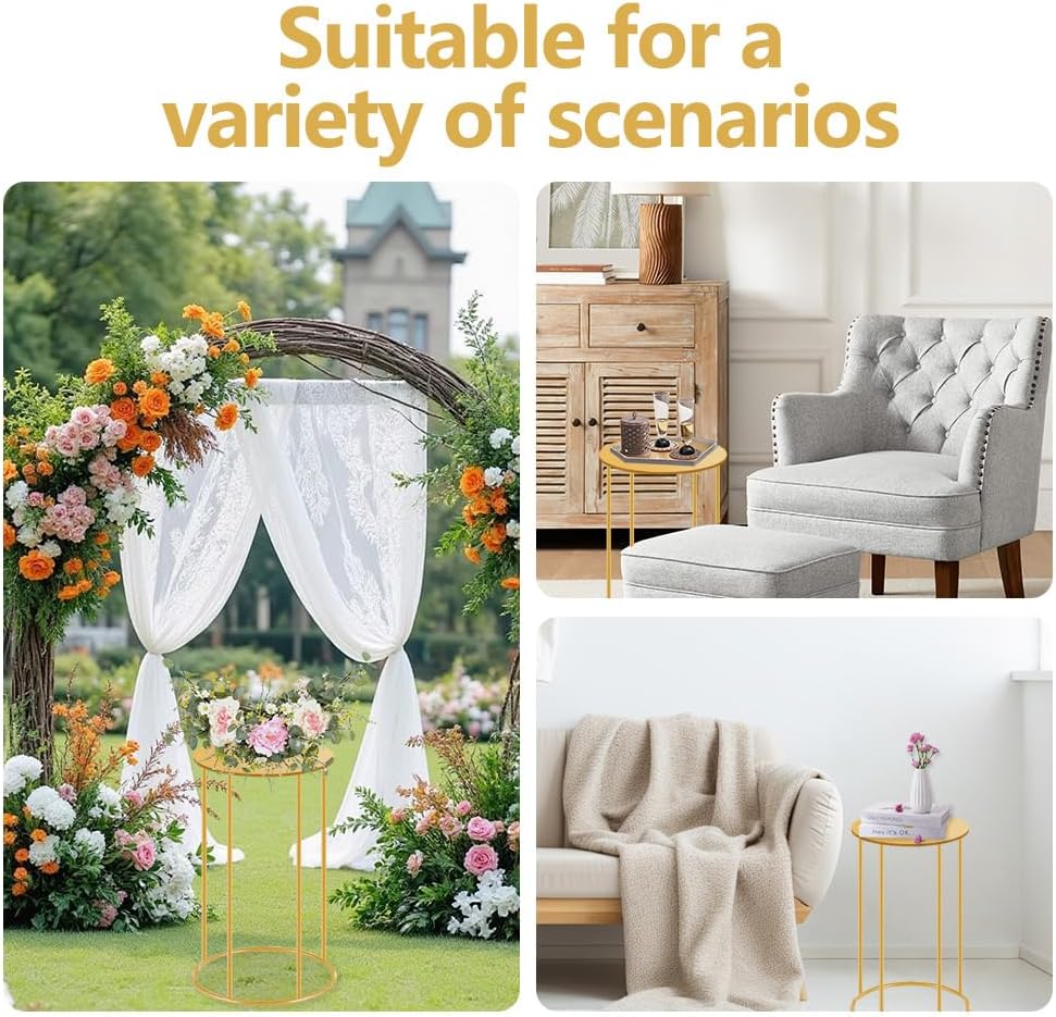 • 【Metal Display Stand - Dimensions】 Each decor stand measures 21.6 inches in height and 9.8 inches in width. Gold party tables remain a top choice for today's popular event styling. Easily decorate with balloons, flowers, greenery, LED strings, or other elements to create a custom backdrop. Suitable for both indoor and outdoor use.