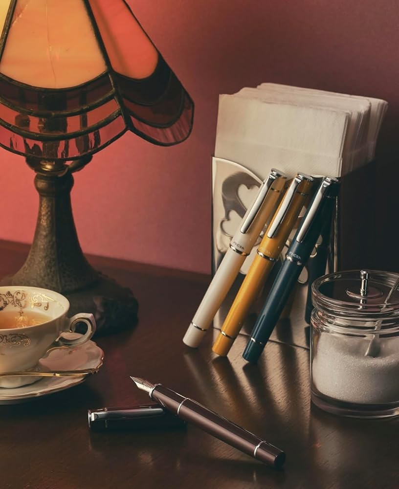 Designed with the theme "Cherishing thoughtful moments with a fountain pen," this pen is available in four elegant colors inspired by vintage interiors found in classic coffee shops.
