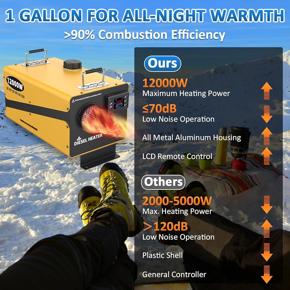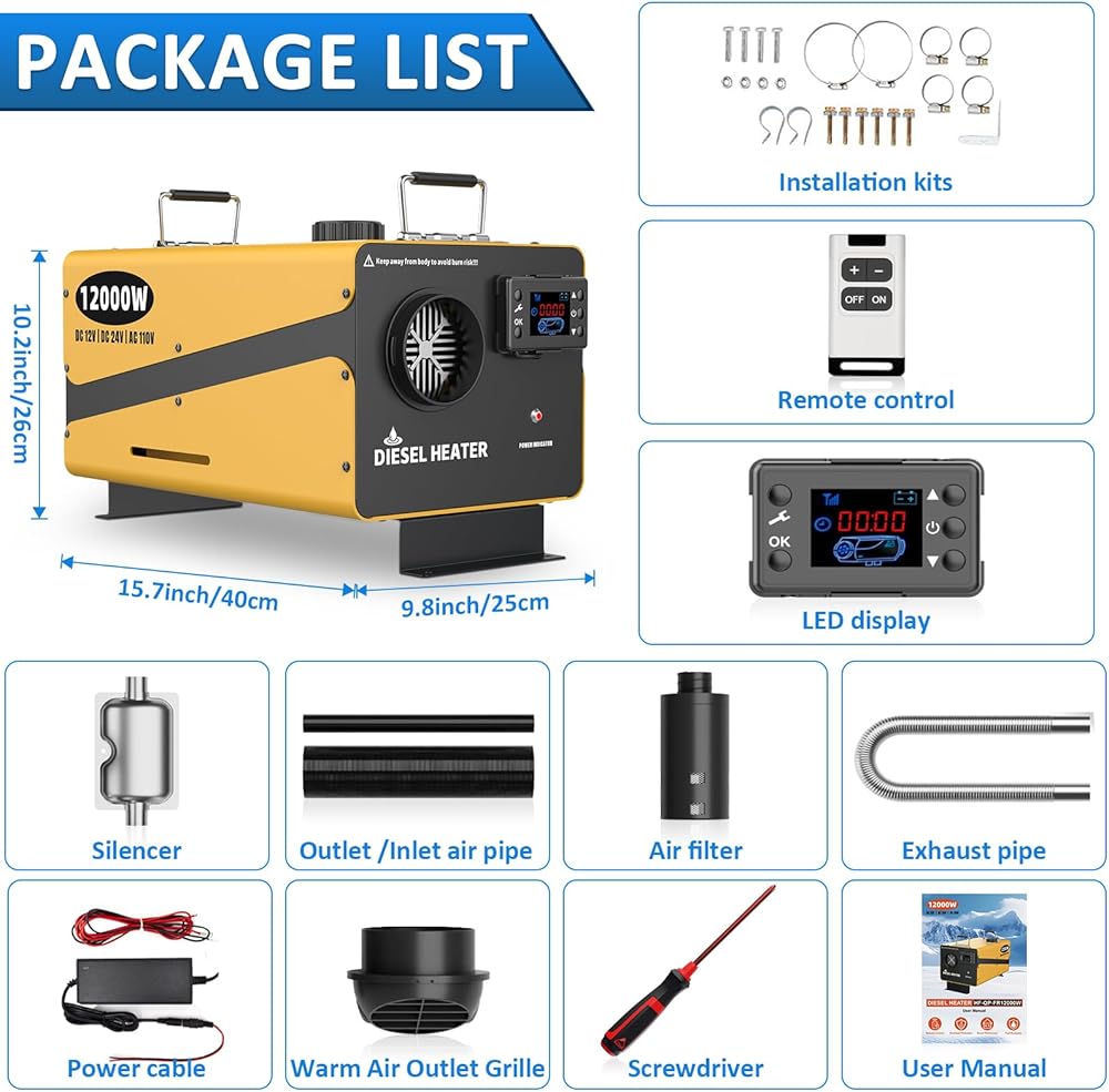 • 📦 وحدة الكل في واحد: هذا السخان عبارة عن وحدة متكاملة تمامًا بجسم معدني بالكامل. تم تركيب جميع الأجزاء — فقط قم بتوصيل العادم. خزان الوقود محكم الإغلاق ضد التسربات والأبخرة. قم بتوصيل الكابلات الموجبة والسالبة، واضغط على زر واحد، وسيبدأ التشغيل - كل شيء آخر تلقائي. في الأساس 100٪ التوصيل والتشغيل.