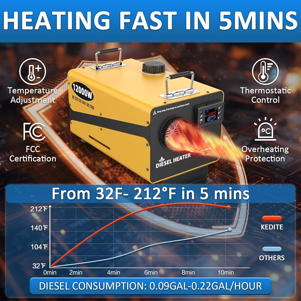 • 💪 كفاءة توفير الطاقة: يستخدم 1 جالون فقط في الليلة، مع استهلاك الوقود بين 0.09-0.22 جالون في الساعة. فهو يضبط استخدام الوقود وإخراج الحرارة بذكاء بناءً على درجة الحرارة في الوقت الفعلي داخل سيارتك - دون إهدار الطاقة. يخفض استهلاك الوقود بنسبة تزيد عن 39% مقارنة بالسخانات التقليدية، مما يوفر لك المال. يستمر الخزان الممتلئ لمدة 10-12 ساعة بكامل طاقته. احصل على سخان التوقف بقوة 12000 واط وحافظ على دفء عائلتك طوال فصل الشتاء.