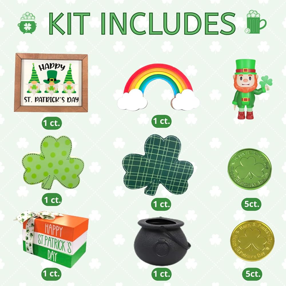 16 قطعة من زينة عيد القديس باتريك - ديكور يوم القديس باتريك - ديكور صينية متدرجة - ديكور خشبي لمنزل المزرعة يوم القديس باتريك - ديكور شامروك ريفي للمنزل - وعاء من العملات الذهبية
