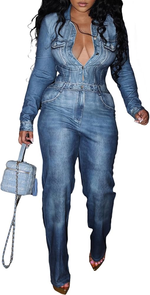 Women's Denim Print Long Sleeve Button Sexy Jumpsuit Clubwear