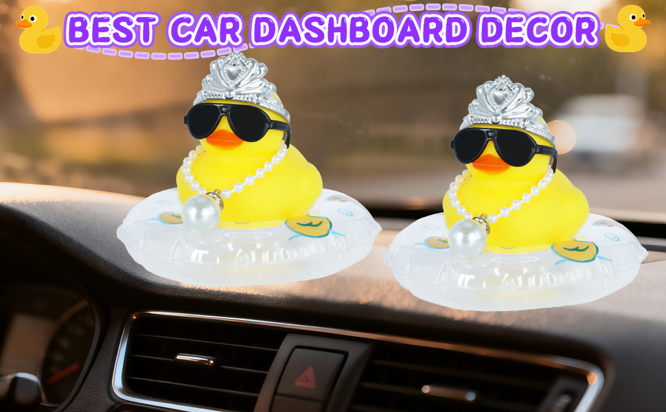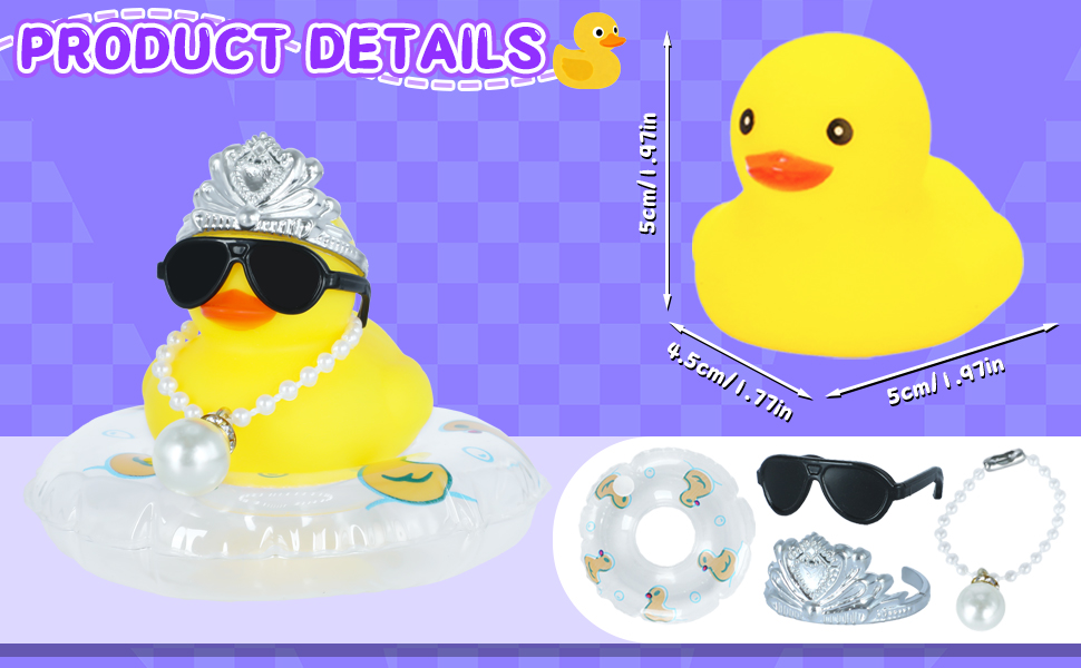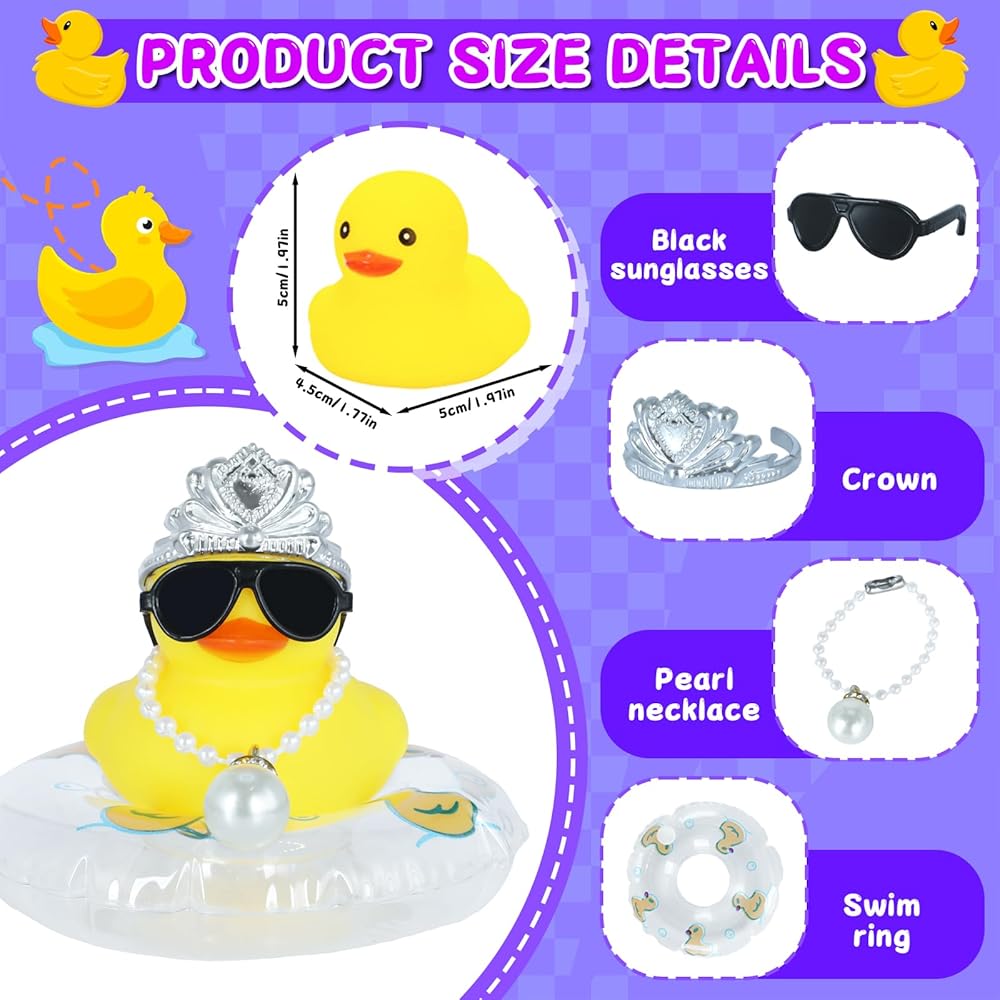 🎉 FUNNY MULTI-ACCESSORY DUCK – This adorable rubber duckey comes with a mini crown, cool sunglasses, a shiny pearl necklace, and a bright swim ring, creating a hilarious character to decorate your car dashboard, desk, or any space for instant smiles.