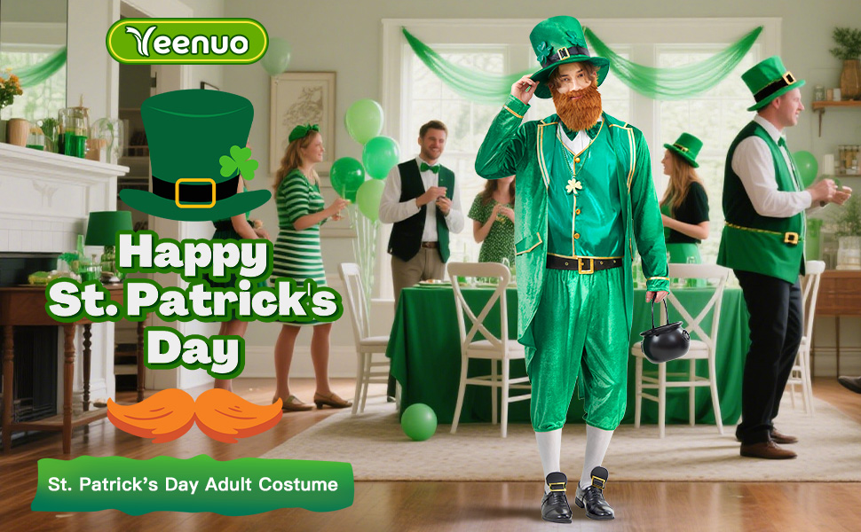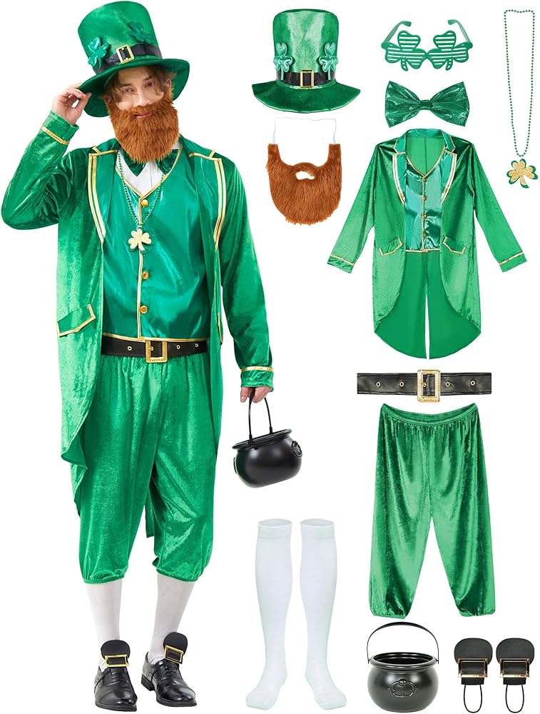 مجموعة أزياء الجني الكاملة المكونة من 11 قطعة للبالغين: يتضمن زي الجني الخاص بيوم القديس باتريك هذا مجموعة كاملة مكونة من 11 قطعة لسهولة التصميم من الرأس إلى أخمص القدمين. يتميز الزي بسترة معطف خلفي أخضر، وسروال مطابق، وقبعة طويلة، ولحية صناعية، وربطة عنق، وحزام، وقلادة، وأغطية أحذية طويلة، وجوارب، وإكسسوارات ذات طابع خاص. مجموعة أزياء عيد القديس باتريك الكل في واحد توفر الوقت وتوفر مظهرًا متناسقًا للبالغين للحفلات والمسيرات والمناسبات ذات الطابع الأيرلندي.