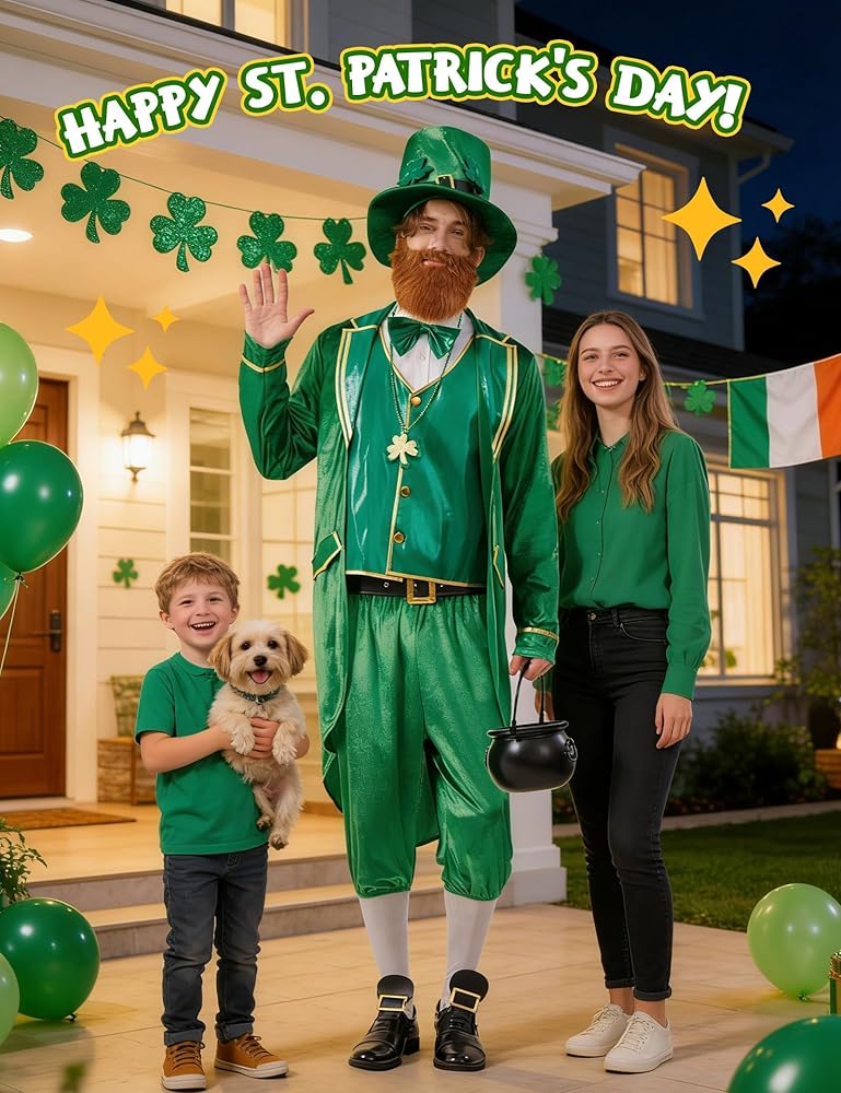 تصميم أيرلندي كلاسيكي بتفاصيل أصلية: مستوحى من طراز الجني الأيرلندي التقليدي، يتميز زي عيد القديس باتريك للبالغين هذا بمعطف طويل أخضر اللون، وأزرار ذهبية مزخرفة، وطيات صدر مزخرفة بالذهب، وعناصر نبات النفل الاحتفالية. يوفر التصميم المتناسق مظهرًا كلاسيكيًا خالدًا يبرز في عروض عيد القديس باتريك والمهرجانات الأيرلندية والفعاليات التنكرية والحفلات ذات الطابع الخاص.
