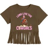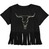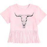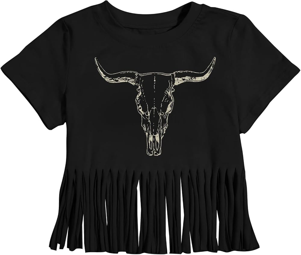 Authentic Western Style: Embrace the cowgirl spirit with this adorable cow head graphic print, featuring playful fringe accents for a genuine Western look.