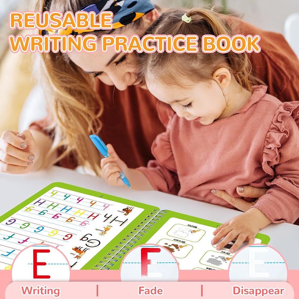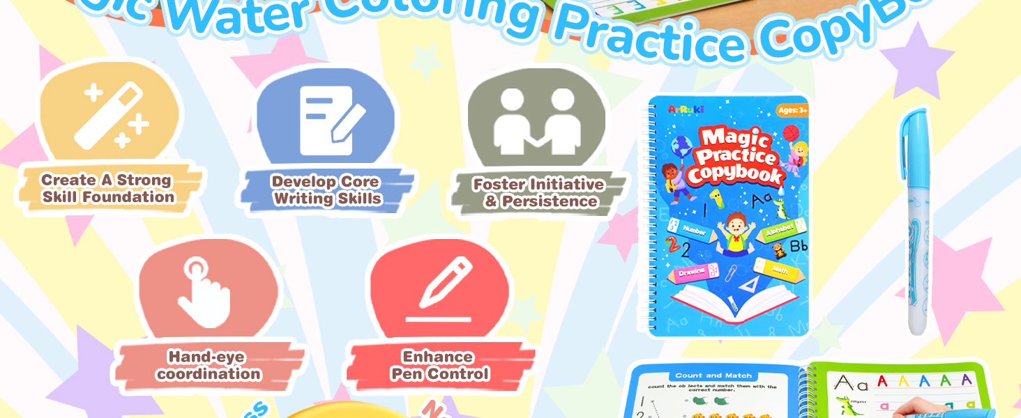 • تصميم فريد من نوعه بالحبر الملون: مطبوع بالحبر النباتي ومطلي بالحبر المنشط بالماء الذي يجعل الشخصيات تظهر، يرشد كتاب التدريب هذا الكتابة ويبني ذاكرة العضلات. يختفي الحبر السحري تلقائيًا خلال 30 دقيقة بعد الكتابة، مما يجعله مثاليًا للتمرين المتكرر.