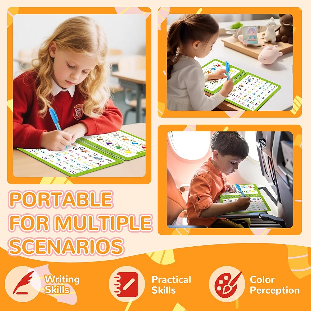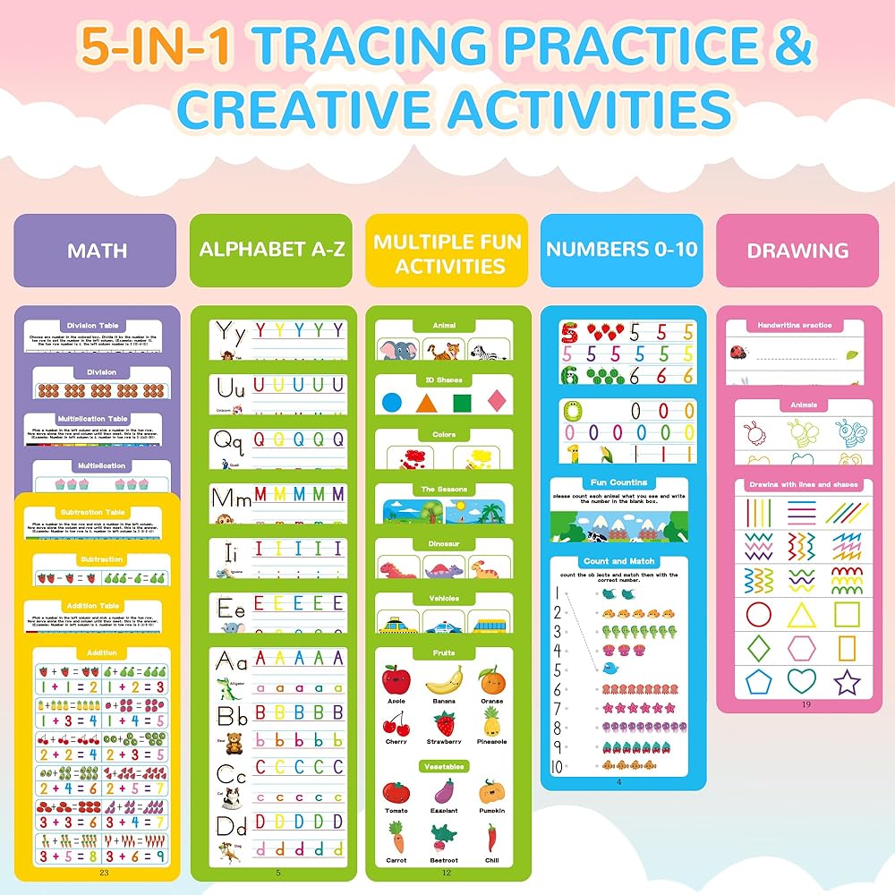 • كتاب تدريب الخط 5 في 1: تحتوي مجموعة تدريب الكتابة للأطفال هذه على 32 صفحة من المحتوى الغني، حيث يمكن للأطفال تعلم الحروف والأرقام والحساب والرسم. تحتوي كل صفحة تعليمية على صفحة نشاط ممتعة في الخلف، تقدم المعرفة حول الفواكه والخضروات والحيوانات والألوان والمزيد - مما يجعل التعلم أكثر حيوية ومتعة.