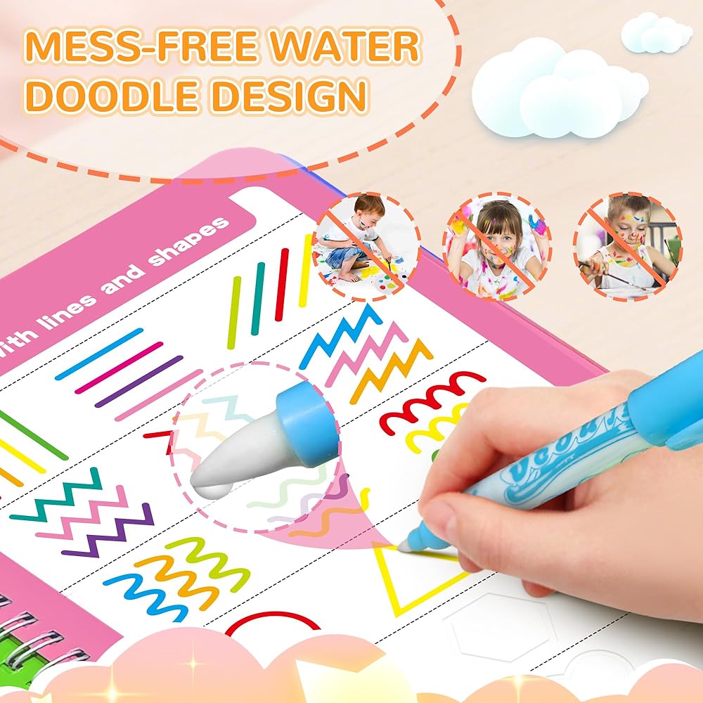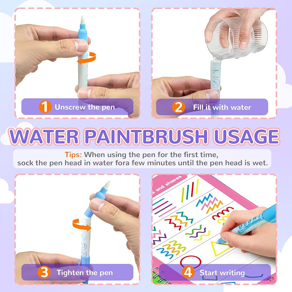 • قابلة لإعادة الاستخدام وسهلة الاستخدام: على عكس دفتر النسخ التقليدي، لا حاجة إلى علامات أو أقلام رصاص أو أقلام تلوين - فقط ماء وفرشاة لاكتشاف اللون. يمكن استخدام الصفحات بشكل متكرر - ما عليك سوى الانتظار بضع دقائق حتى تجف الصفحة ويتلاشى اللون، ويمكن للأطفال البدء في الإنشاء مرة أخرى.